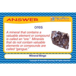 NewPath Learning Mineral Bingo is played with 75 standard-based review cards which includes details of the mineral's physical properties, special properties and common uses. Each double-sided card includes a vivid, color photograph and information about a mineral on one side. The reverse side features a question, challenge or learning statement. This card is printed in color on durable, heavy cardstock and also can be used as flashcards for independent reinforcement and review. Each game includes 30 full-color bingo cards, 300 markers and comes with comprehensive teacher's guide.Includes: (30) Full-Color Bingo Cards, (300) Markers and A Comprehensive Teacher's Guide