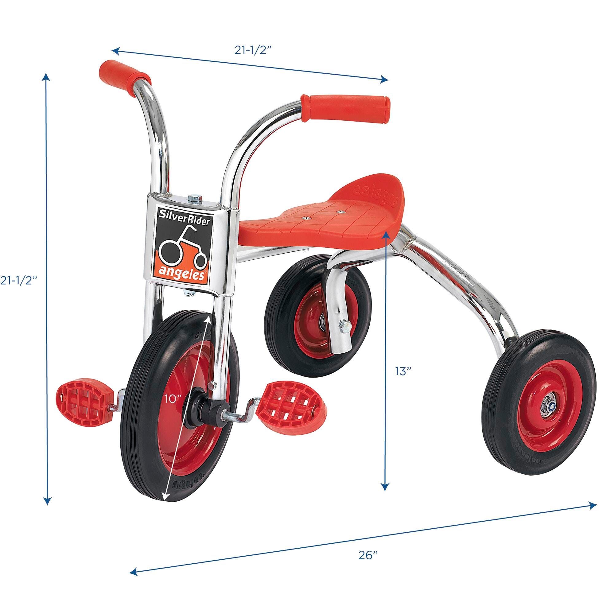 Angeles® SilverRider Trike beats the competition with lifetime service and replacement parts available. Trike has a durable chrome plating and welded steel frame with heavy-duty rubber handgrips. The seat has a comfort back support. Features a no pinch point steering limiter. The crank is one-piece welded and has non-exposed pedal hardware. The wheels are solid rubber on spokeless, steel wheels and feature a recessed hub. Nylon bearings are long lasting and self-lubricating. Includes a 5-year guarantee. Ships fully assembled. Recommended for Ages 3 to 4.