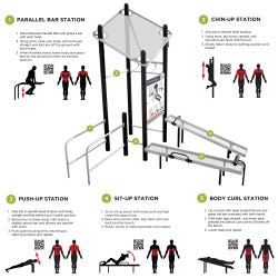 The adult fitness station is perfect for users with limited space. This package efficiently addresses muscle fitness and core, ensuring a great upper-body and core workout. Designed for ages 13 and up. FitTech items include a sit-up station, body curl station, pull-up bar, chin-up bar, and dip station.Features