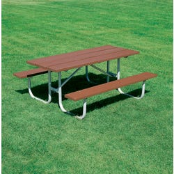 This Heavy Duty Outdoor Picnic Table by UltraSite lends a redwood-stained rustic aesthetic to your outdoor space. This table combines natural beauty with durability, lending the strength of its MIG welded 1-5/8 walk-through frame for long-lasting stability and support to last for years of picnics and outdoor board games. Comes with two benches on either side of the table. Built to blend seamlessly with other UltraSite outdoor furniture solutions. Some assembly is required. This table measures 96 W x 60 D x 30 H inches.Features