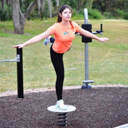 The ActionFit balance board packs a punch in a small space. The spring base offers an added challenge as muscles work to react to completing familiar exercises in a new context. The board wobbles and flexes as the user attempts standing squats, single-leg lifts, or even push-ups. The convenient handles routed into the surface provide comfortable grips for arm exercises like push-ups and dips. It is designed for ages 13 and up making it perfect for upper middle and high school campus gyms or Outdoor Fitness areas.Features