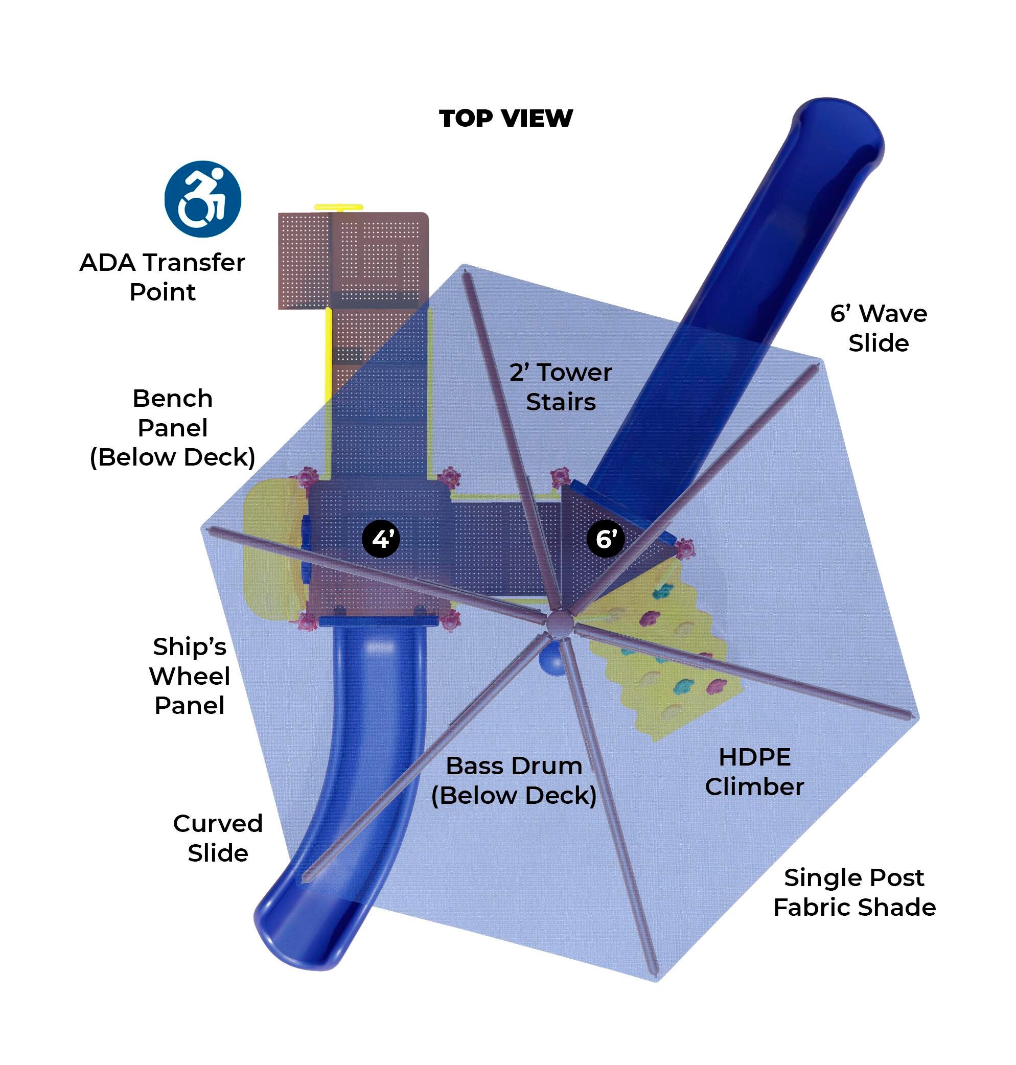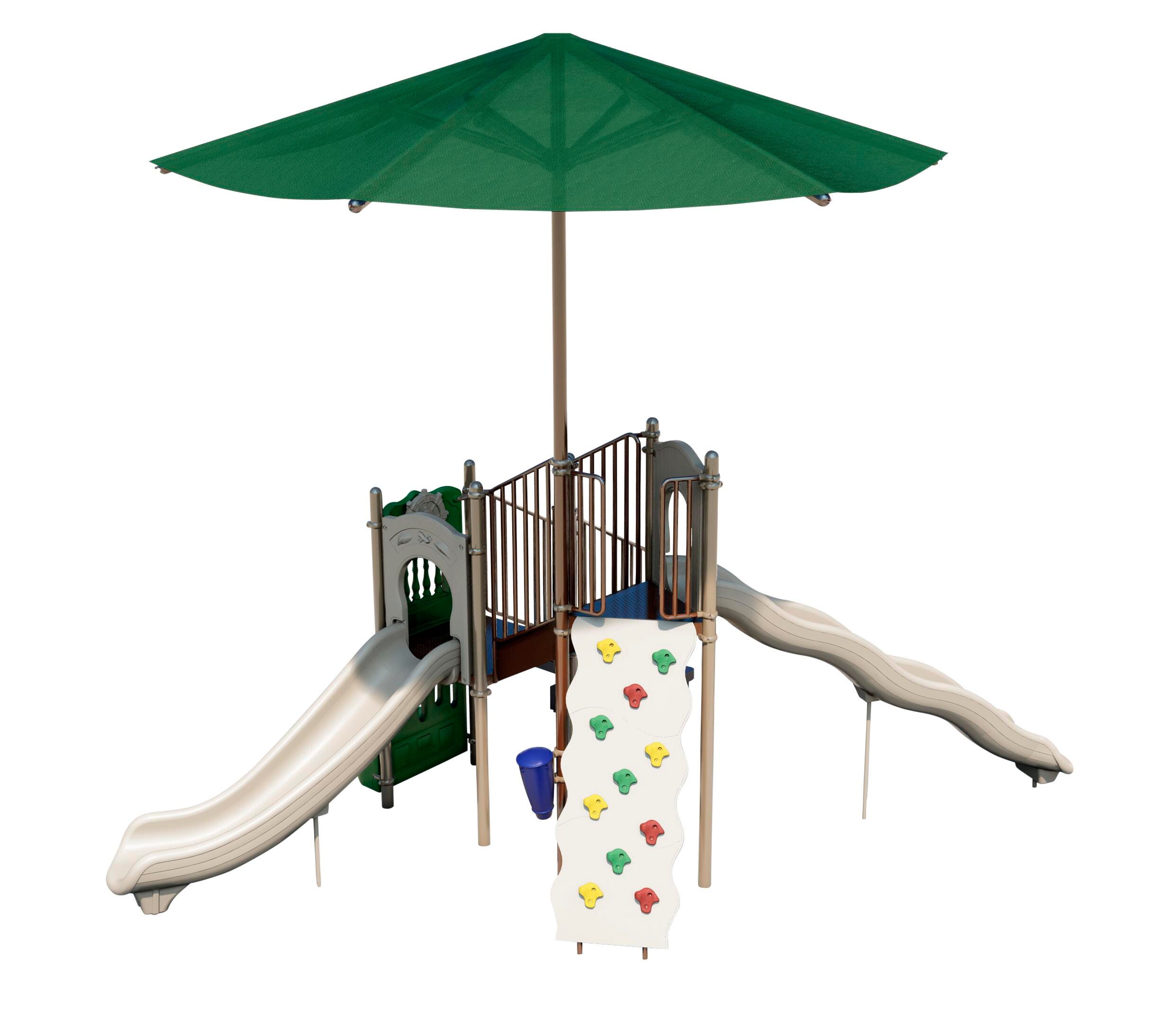 The Timber Glen features a roof to provide shade Two slides at different heights to give children different sliding experiences. The Deluxe Rock Climber combines both upper and lower body strength while developing important motor skills. When children need a break, they can hang out on the Bench Panel or make music with the Bass Drum. This structure meets ADA guidelines and is commercially compliant with ASTM & CSPC. A ground spike surface mount is included with the structure, but an anchor bolt surface mount or in-ground mounting kit can be purchased separately. The posts are 13-gauge galvanized steel tubes and powder coated. The plastics are heavy-duty rotomolded & blow molded components. The critical fall height is 6 feet.Features