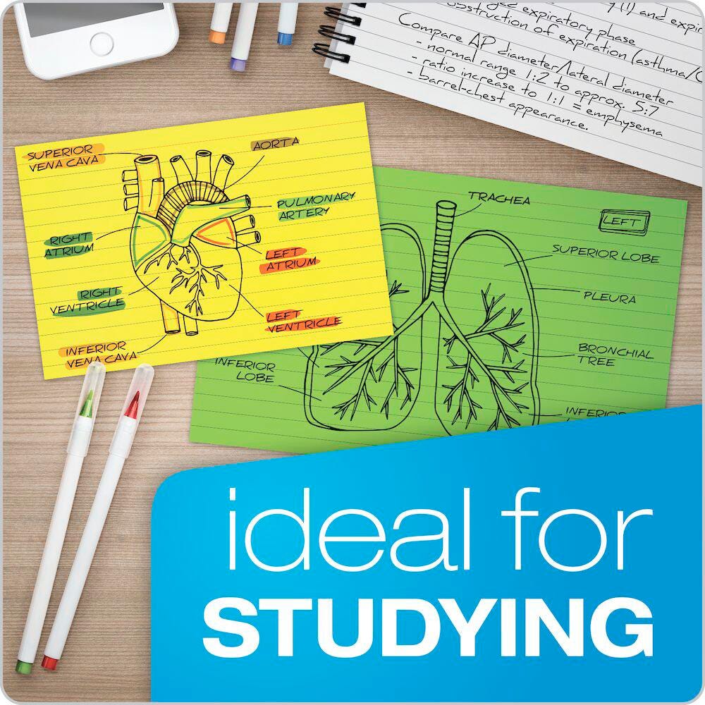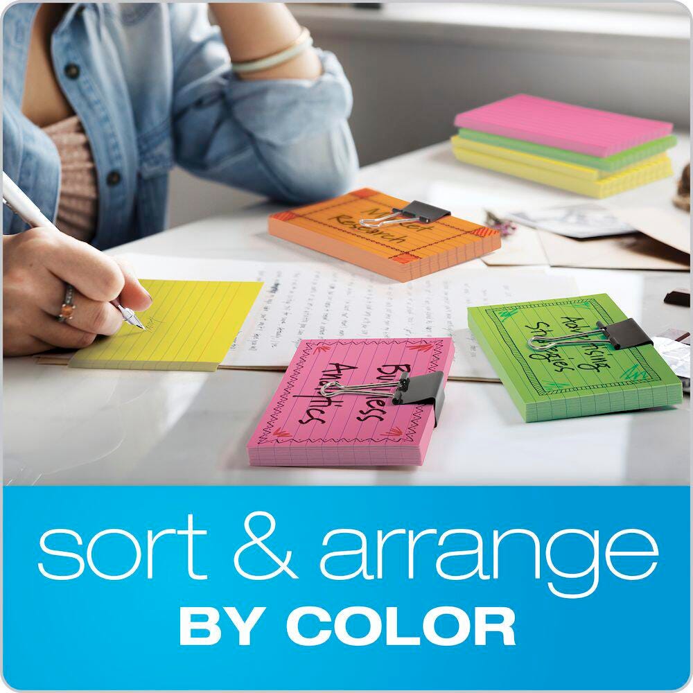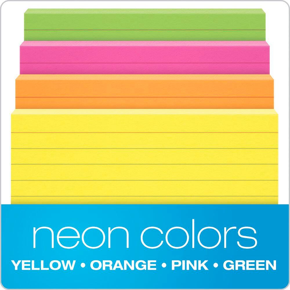 Oxford Neon Index Cards are a brilliant way to prep for tests and presentations. Ruled on one side for fast, legible note taking, these cards help you color code your way to success. Proudly Each card measures 4 x 6 inches. Assorted neon colors: pink, orange, yellow, green. Ruled. 100 Per pack.