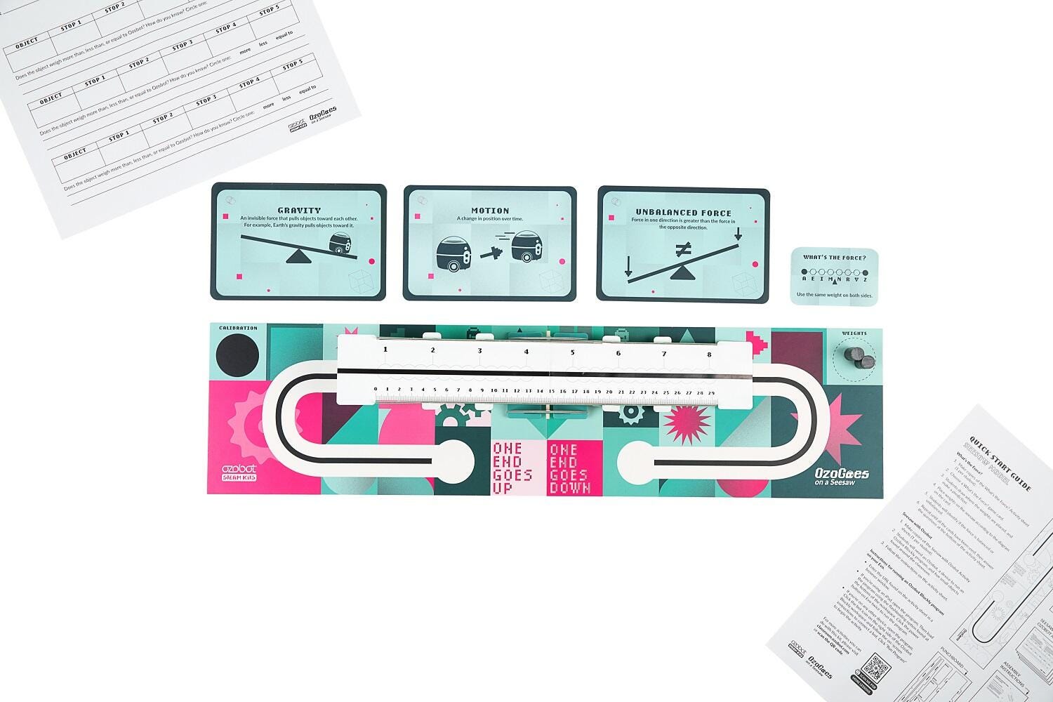 Learn about leverage and simple machines with OzoGoes On a Seesaw. Gain important STEAM skills with one easy-to-use kit. Designed to supplement classroom learning, Ozobot STEAM Kits offer ready-to-use creative and educational activities that encourage problem-solving, critical thinking, and collaboration through practicing real-world applications. Recommended for ages 8 and up.Features