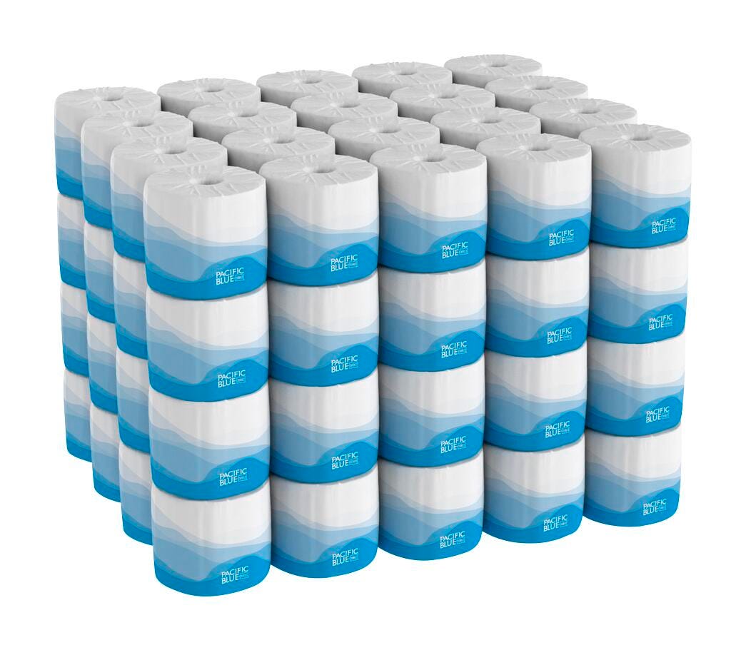 Pacific Blue Select two-ply bath tissue features an elegant iris emboss, quick absorbency, durability and thickness. Each roll offers 550 sheets. Each sheet measures 4 x 4-1/20 inches. EPA-compliant tissue is made from high percentage of recycled material and safe for all standard sewer and septic systems. White.