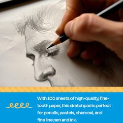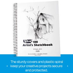 This Sax 100 Artist's Sketchbook is a great place to practice techniques for artists of all levels! The sketchbook contains 100 sheets of extra-heavy, 80 lb, 100% white sulphite drawing paper with a fine tooth finish. The sketchpad is ideal for all types of drawing media, including pencil, charcoal, and pastel. The front cover, made of heavy stock, protects your artwork and is less likely to tear from binding, and the back is rigid for additional support and protection. The drawing pad is bound on the side with an oversized black plastic spiral so the pages turn easily and lie flat.Features