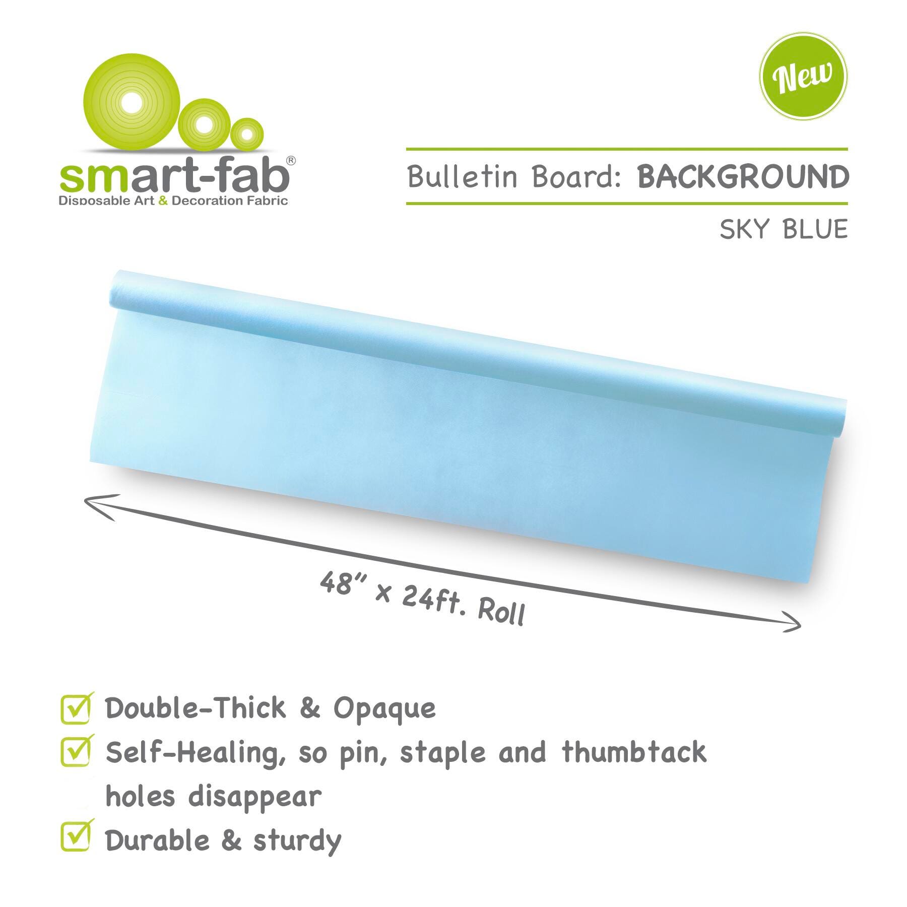 Smart-Fab Opaque Bulletin Board Background rolls on flat, stays smooth and deliver outstanding results. The double-thick background is durable and self-healing, allowing pin, staple and thumbtack holes to disappear so you can reuse backgrounds. Smart-Fab backgrounds are flexible, strong, easy to work with, and they're recyclable. Fabric roll measures 24 feet x 48 inches. Sky Blue. Sold as a single roll.
