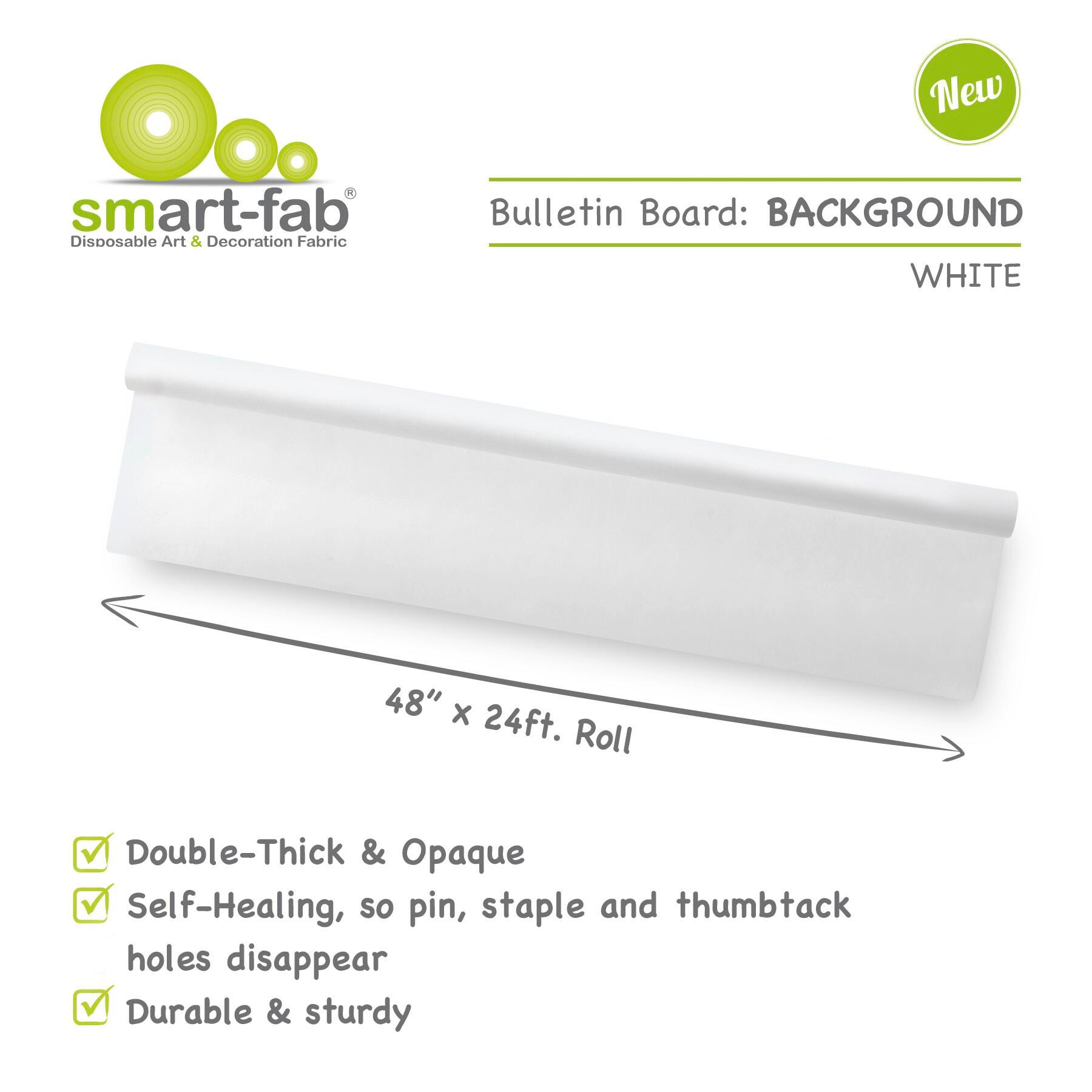 Smart-Fab Opaque Bulletin Board Background rolls on flat, stays smooth and deliver outstanding results. The double-thick background is durable and self-healing, allowing pin, staple and thumbtack holes to disappear so you can reuse backgrounds. Smart-Fab backgrounds are flexible, strong, easy to work with, and they're recyclable. Fabric roll measures 24 feet x 48 inches. White. Sold as a single roll.