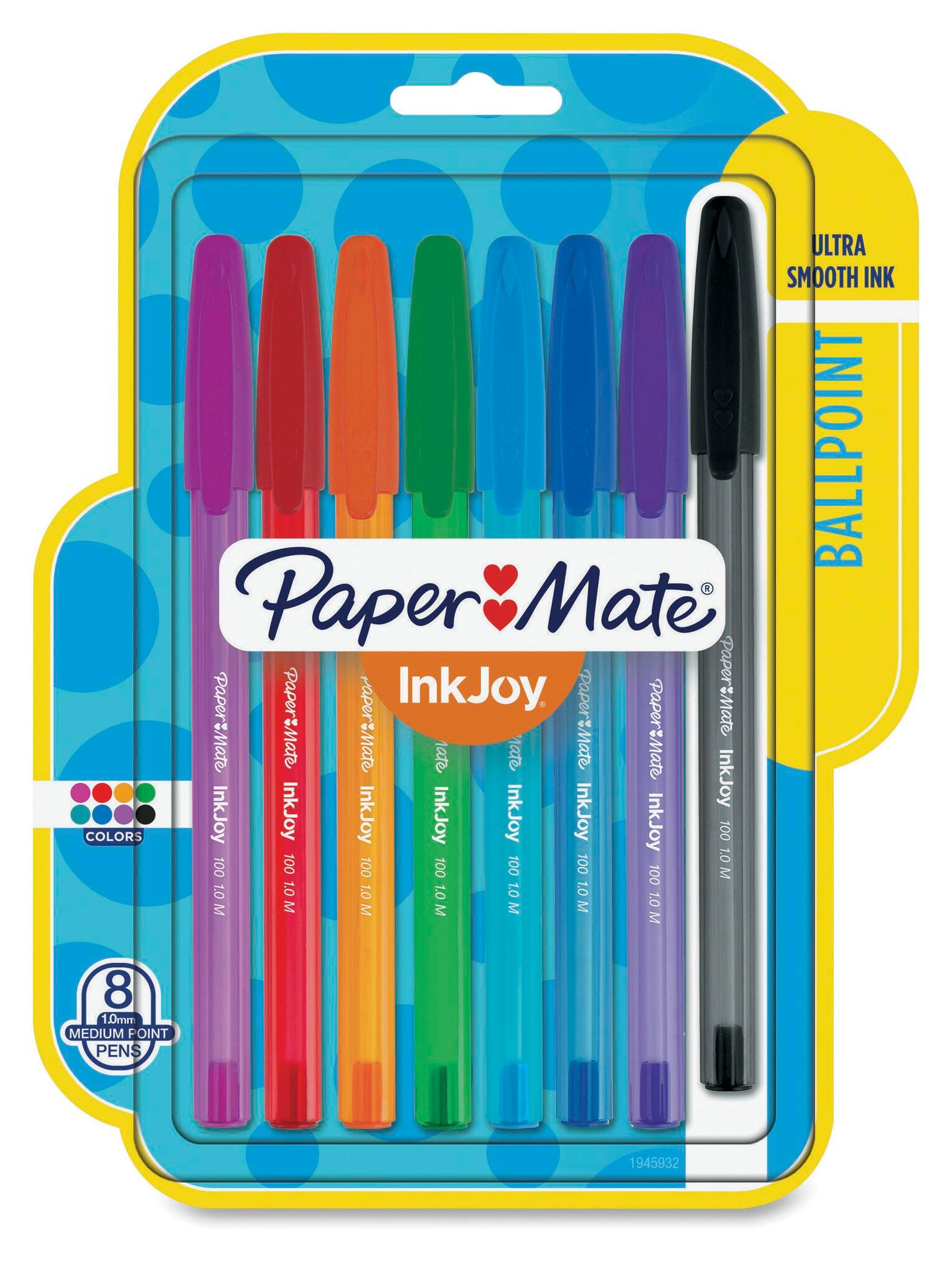 The 100ST Ballpoint Pens feature Paper Mate's revolutionary InkJoy writing system to give you the best in effortless writing. The InkJoy writing system starts quickly without dragging, requires minimal pressure from your hand, and delivers crisp, consistent lines. Plus, transparent color-tinted barrels offer a fun and refreshing look. Sold as a set of 8 assorted colors including black, blue, green, red, purple, turquoise, orange, and magenta.Features