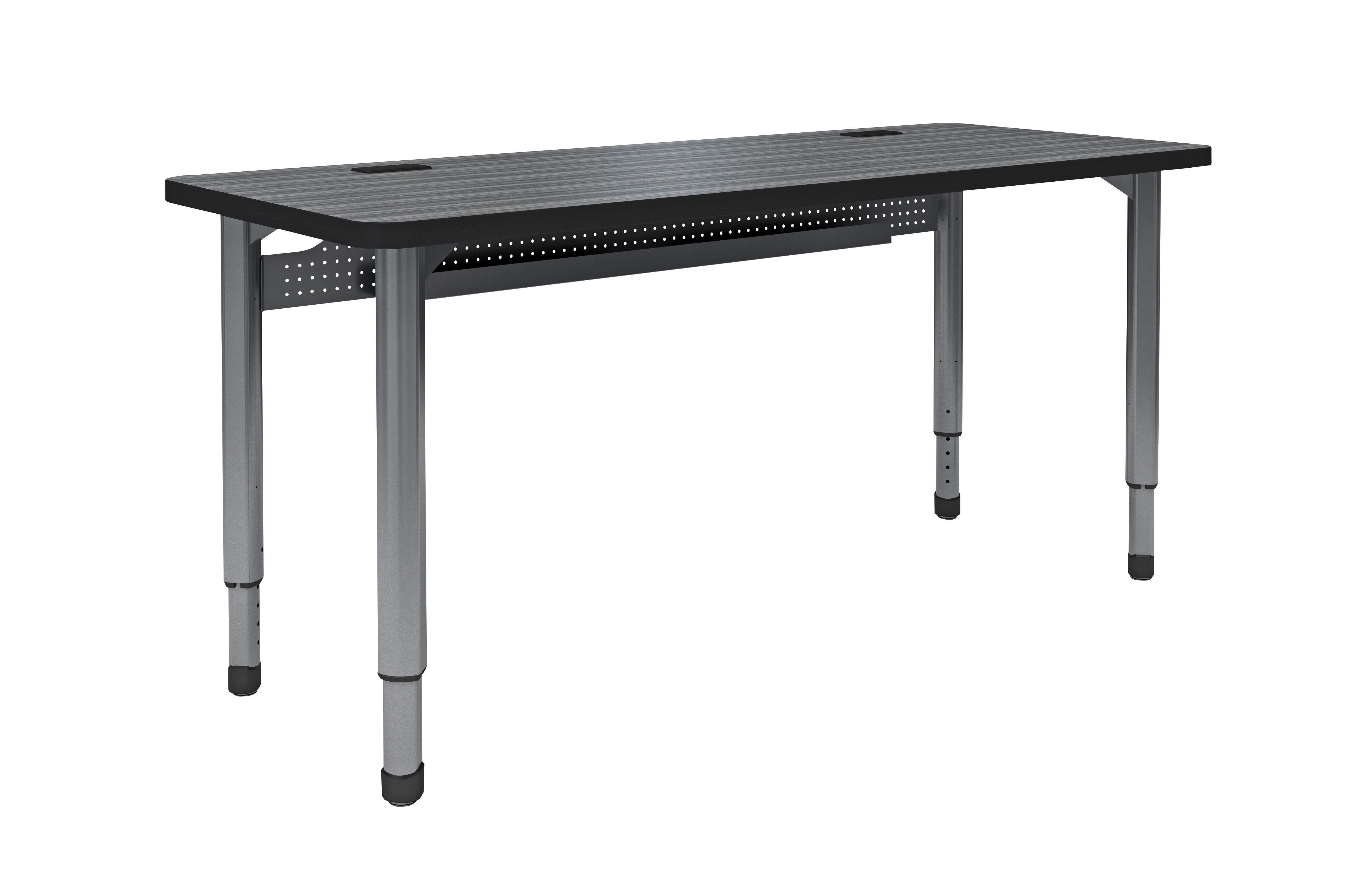The Paragon TRAIN-IT table features a perforated J-channel wire manager. 1-1/4 inch HPL laminate top with 3/8 inch racetrack edge available in black or graphite. Standard black or titanium single post leg is 14 gauge steel tube and lower leg is 16 gauge steel with perforated 1/4 inch holes every inch to allow for patent-pending height adjustment bezel sleeve that contacts leg insert at 8 contact points