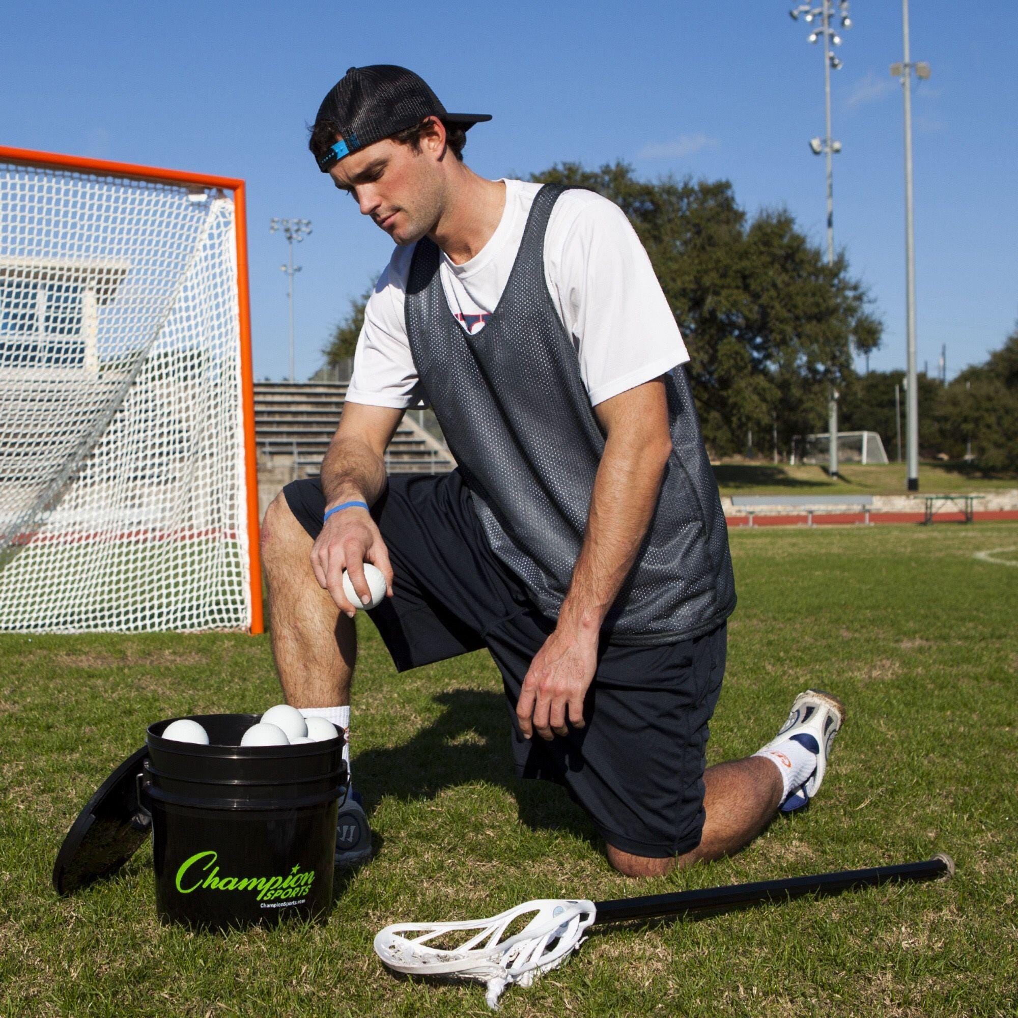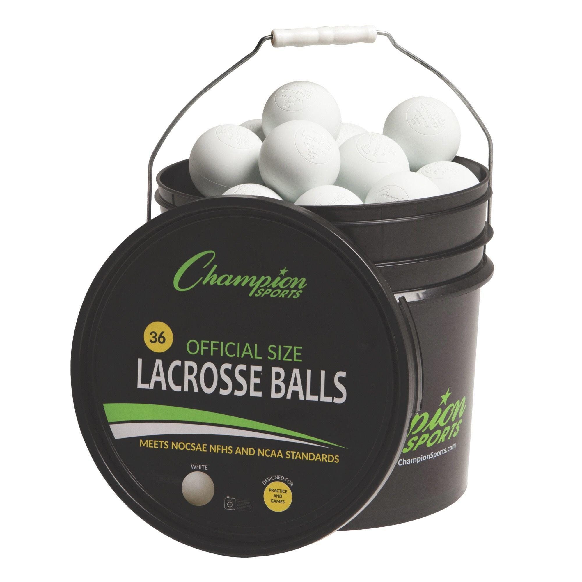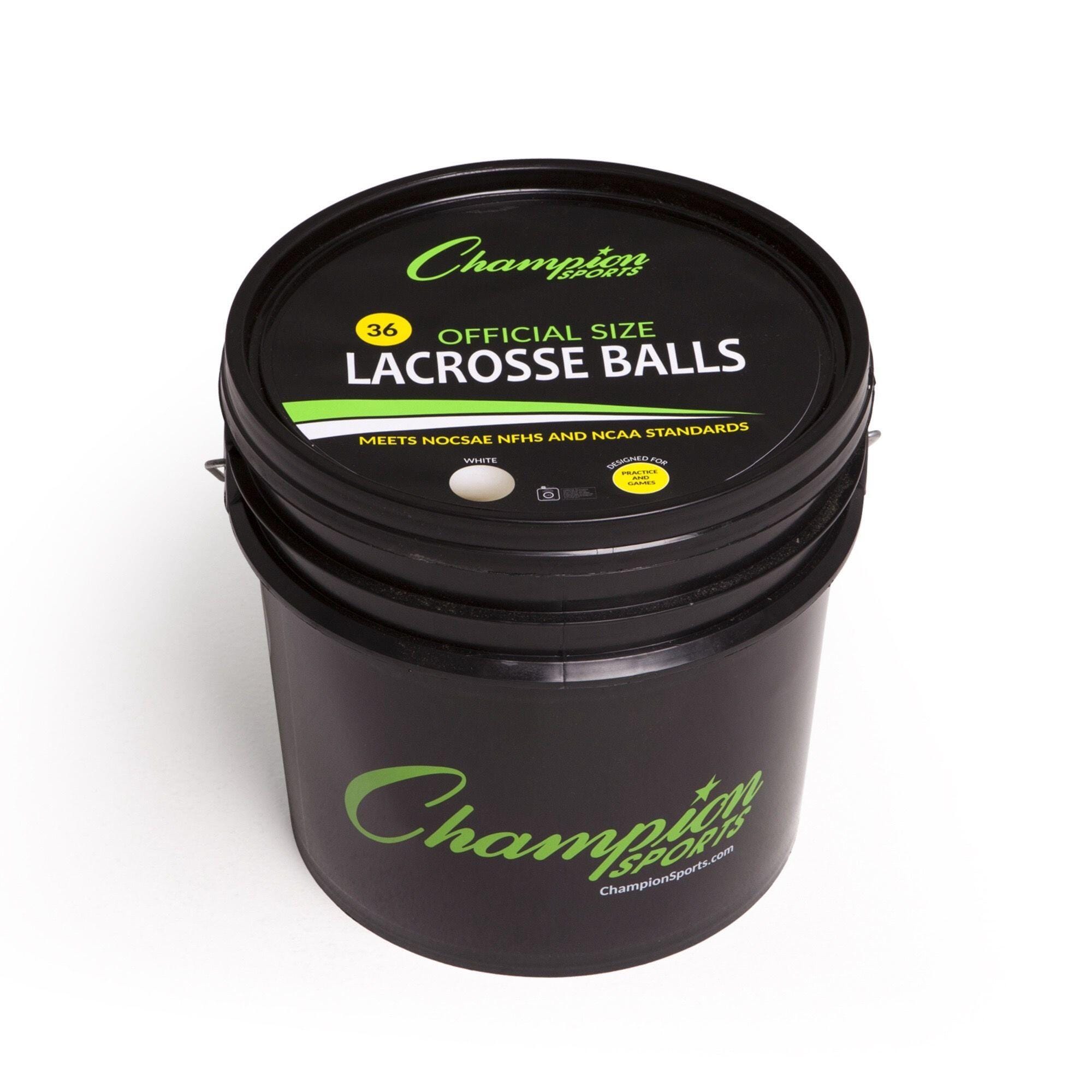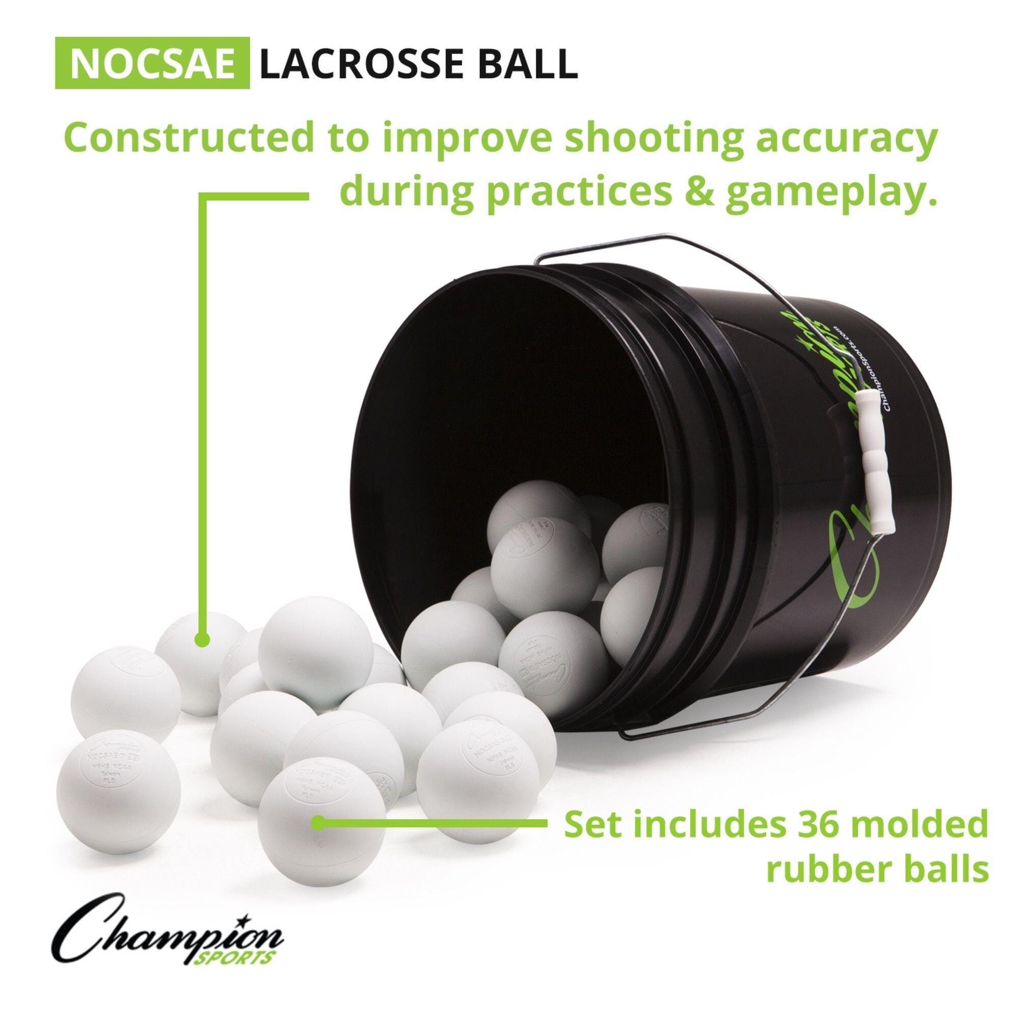 For lacrosse practices at any level, the Champion Sports Lacrosse Ball Bucket includes 36 regulation lacrosse balls that meet NOCSAE® standards, are approved by the NCAA/NFHS, and SEI Certified. These molded rubber balls are designed for improved feel and accuracy when playing, and are of the official size and weight required by professional lacrosse leagues.