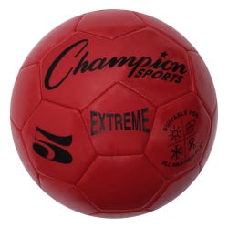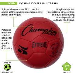 Great for recreational and competitive league games and practices in any kind of weather conditions, the Champion Sports Extreme Soccer Ball is designed with a soft-touch composite TPU cover for a soft feel without compromising the ball's weight and striking power. The butyl bladder offers exceptional air retention, and the patented machine-stitch technology of the panels offers added durability. This red size 5 soccer ball is recommended for athletes ages 12 and up.Features