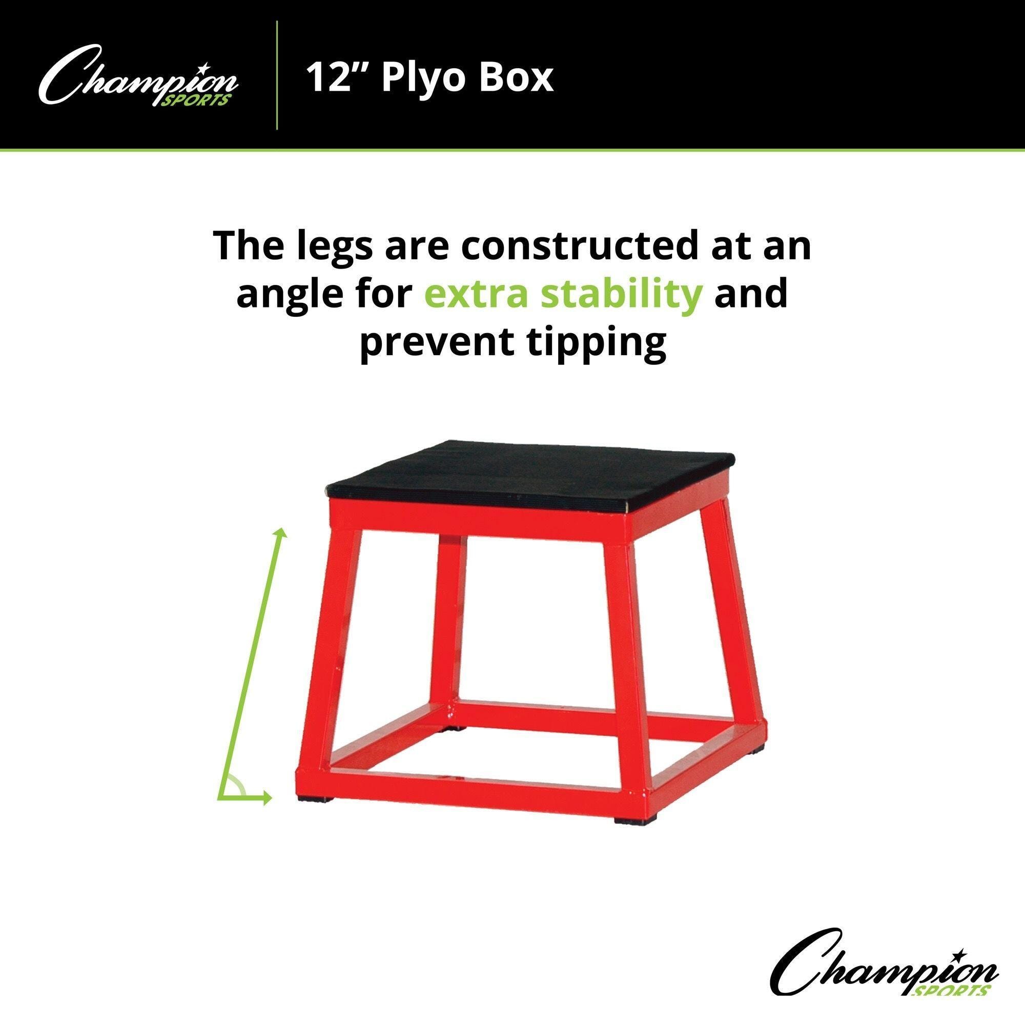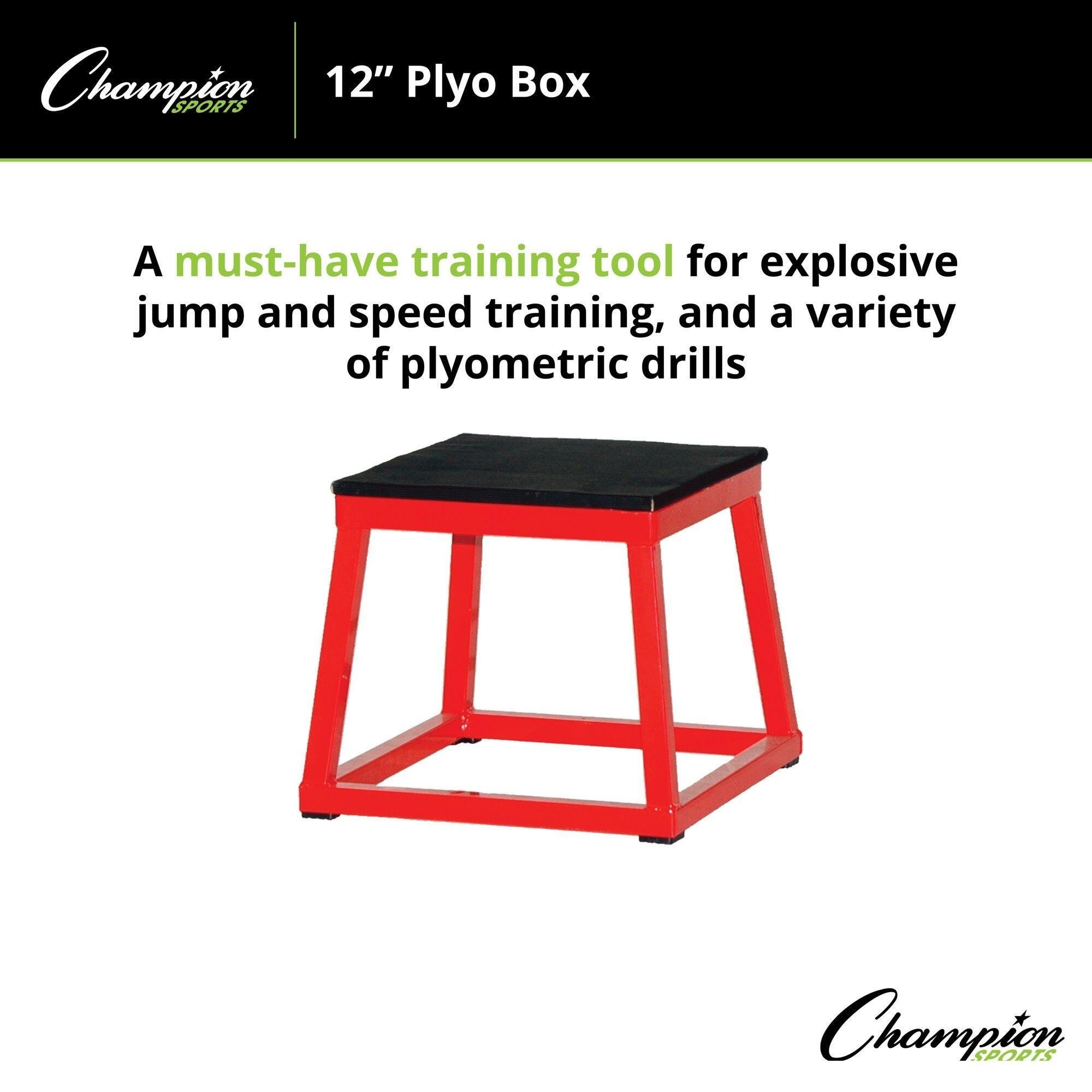 This 12-inch Plyometric Box from Champion Sports provides a versatile solution for agility and strength training. The box is made of 1-inch heavy-gauge welded tubular steel for strength and durability. It features a rubber-coated plywood landing surface that provides optimum grip and slip-resistance. These versatile boxes are a valuable training tool for a variety of plyometric drills, explosive jumps, and speed training. It has angled legs for added stability and non-slip rubber footpads to keep box in place.Features