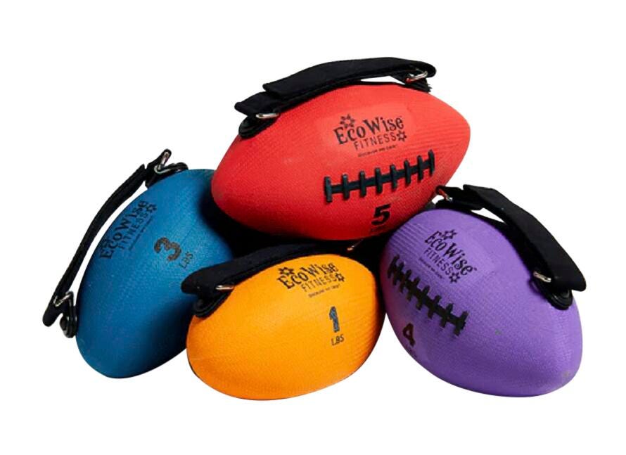 EcoWise Super-Grip Slim 6 Pound Weight Ball offers all the benefits of traditional light weight toning without using hard-to-hold metal dumbbells. The ergonomic shape offers easy-gripping and the textured surface makes it non-slip. Attached strap adds another layer of security and it is adjustable and removable. Petite olive shape design enables a wider range of motion and more functional movements, includes mimicking football tossing motion for various sports training. Color coded with weight level in pounds.