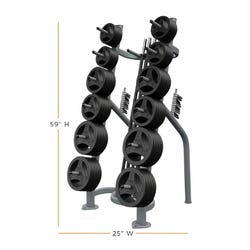 - Rack holds plates, bars, and collars in one convenient and organized location