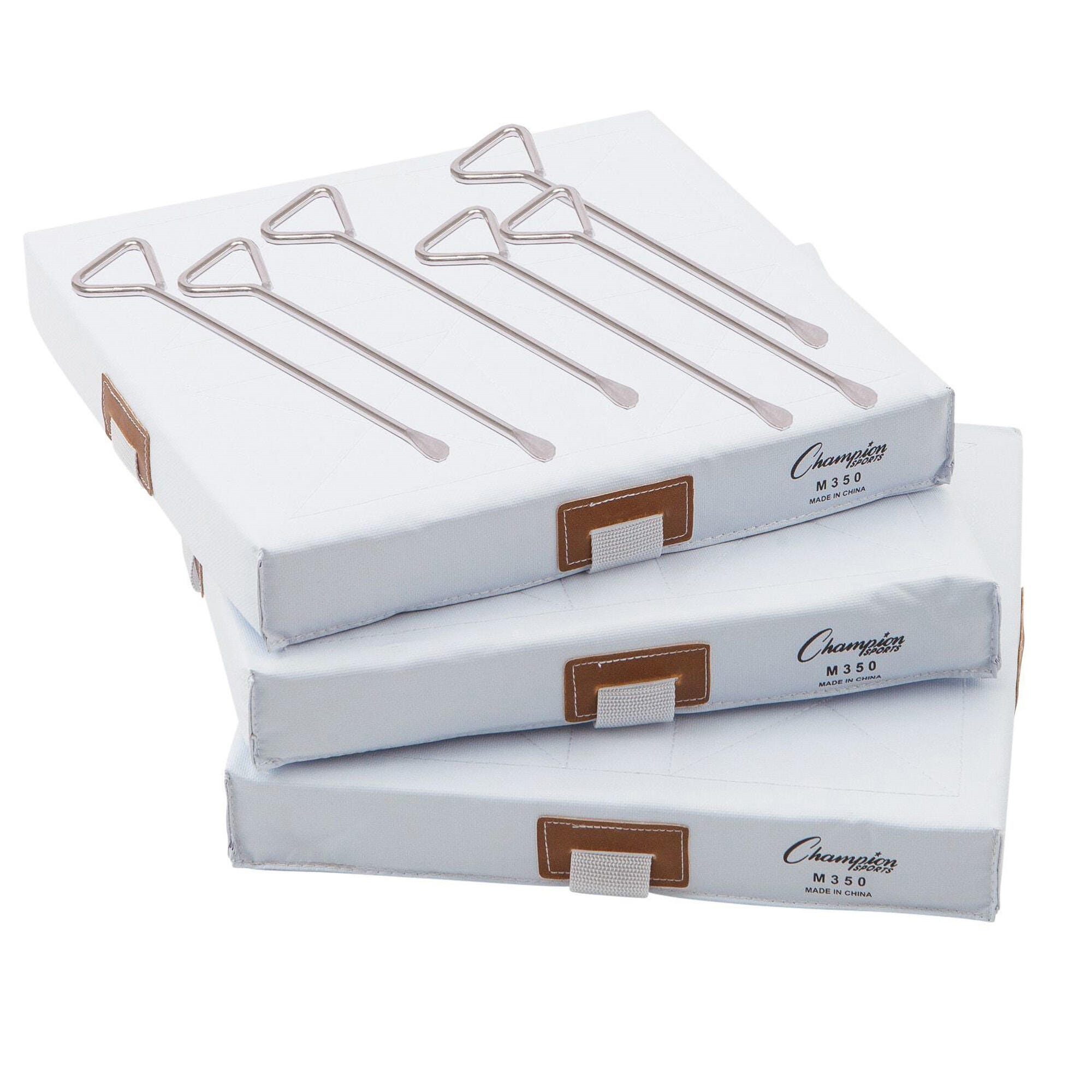 These Foam-Filled Bases from Champion Sports offer excellent in-game feel and are easy to set up. Each base has 2 heavy-duty nylon straps and 2 steel spikes that hold them firmly in place during play. The quilted nylon cover offers durability, and the foam bases are soft on impact. This set contains three bases, each measuring 15 W x 15 L x 3 H inches.