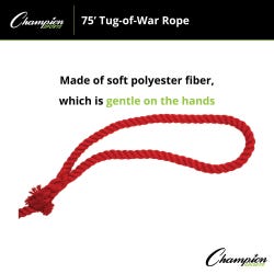 Experience the exciting and cooperative game of tug-o-war with this specially designed rope from Champion Sports! This 75-foot long rope has a 1-inch diameter and a properly textured polyster fiber that is gentle on the hands during any competition. The ends are reversed and spliced into 5-foot long loops for provide safe and effective support for the team anchors. This red rope is an excellent addition to summer camps, physical education classes, and outdoor events!Features