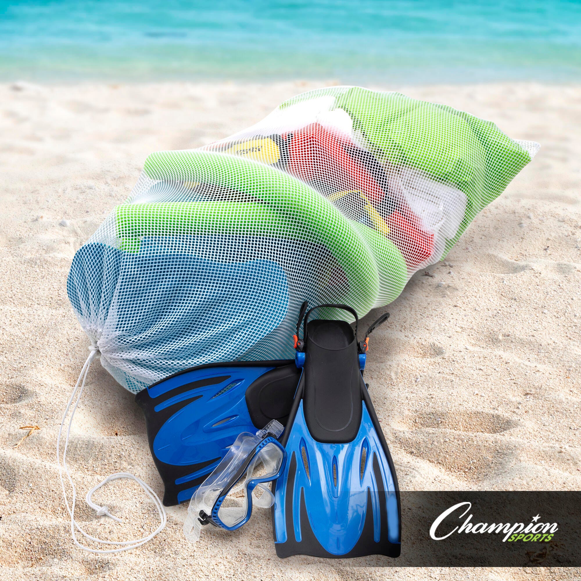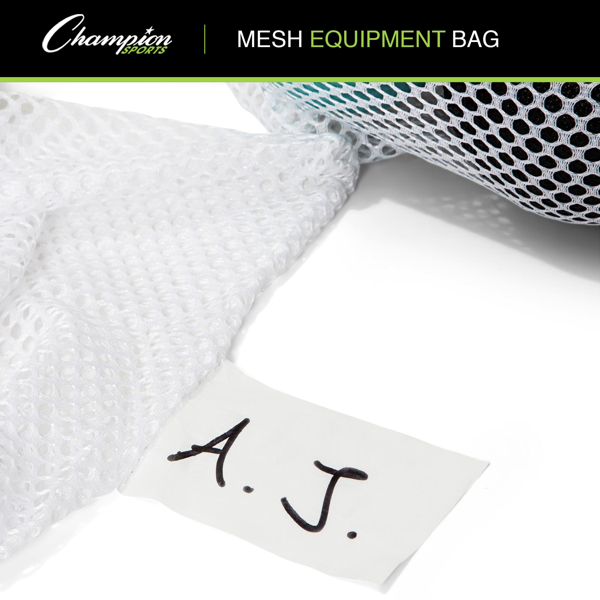 This Mesh Equipment Bag from Champion Sports is an easy way to carry sports gear and balls. The nylon mesh material allows airflow to dry wet gear and keeps loose items secure. Each bag features a drawstring cord, a lock, and an ID tag for easy identification and labeling. The bag measures 48 L x 24 W inches.