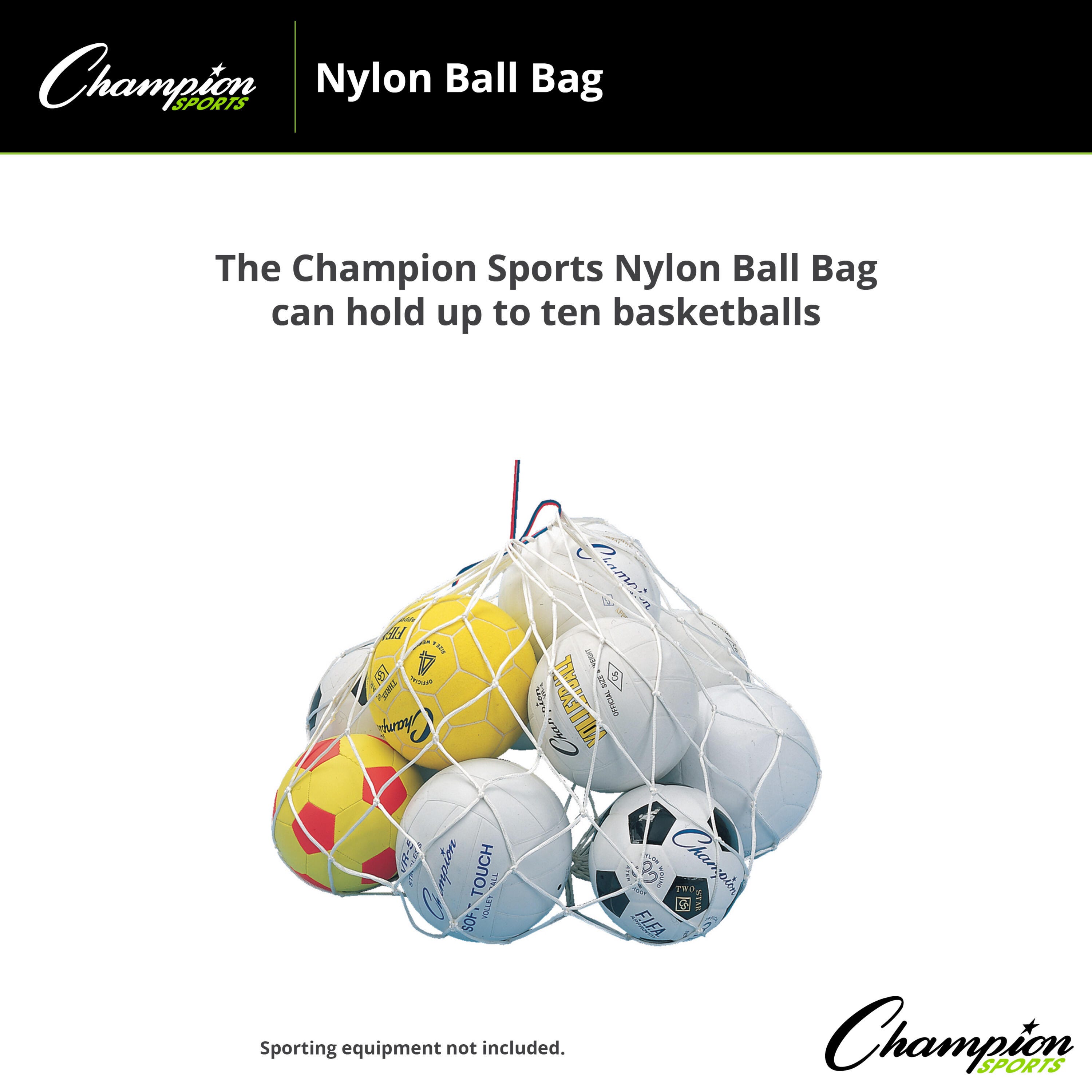 The Champion Sports Mesh Ball Bag is a heavy-duty storage solution designed for schools, gyms, and recreational centers. Constructed from premium 4-inch square mesh, this durable nylon bag provides excellent ventilation for wet or dusty equipment. Featuring a secure drawstring closure and measuring 24 x 36 inches, it offers ample space to store and transport up to ten full-sized basketballs.