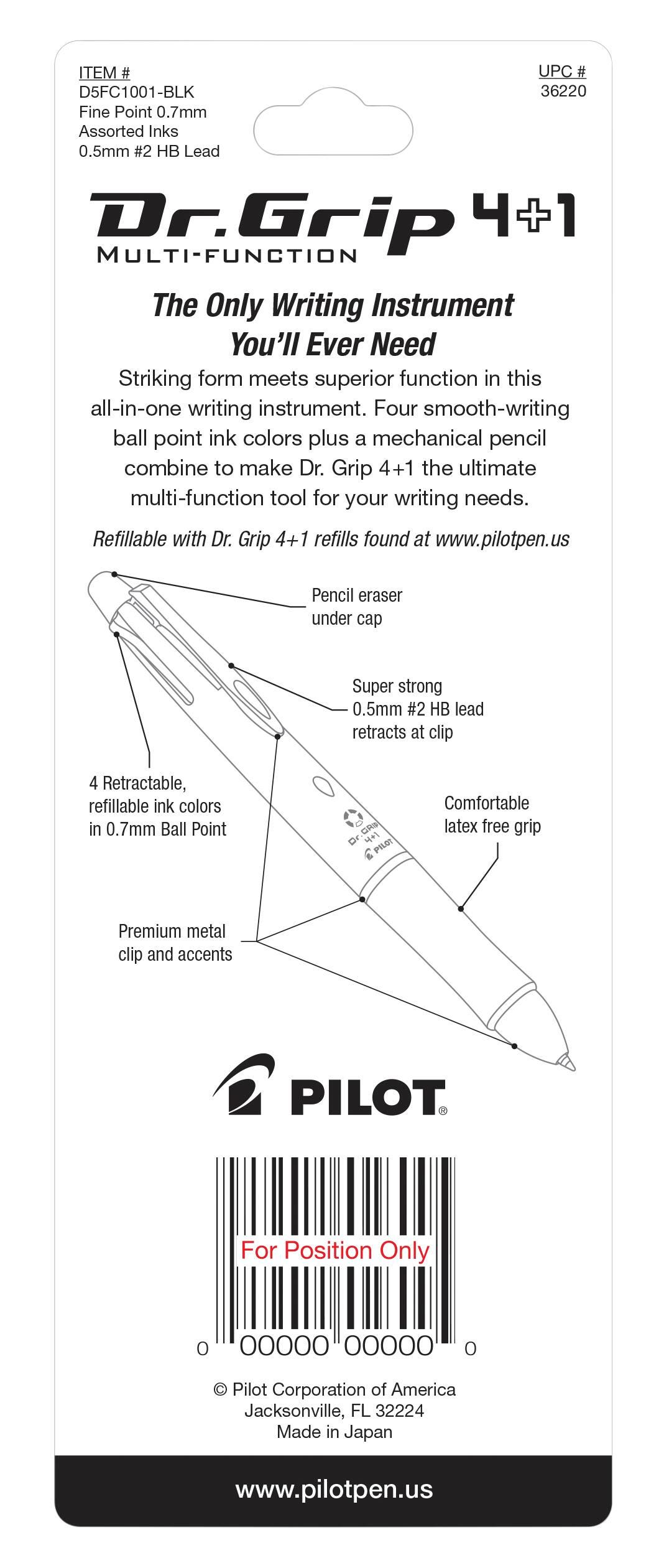 From Pilot the makers of Dr. Grip, comes a new the Dr. Grip 4+1. Dr. Grip 4+1 has it all; with 4 smooth ballpoint ink colors and a mechanical pencil and eraser, it is designed for getting complex jobs done with incredible precision. Pencil eraser under cap lets you erase the 0.5 mm #2 HB pencil lead. All pen ink colors feature a fine 0.7 mm tip.Features