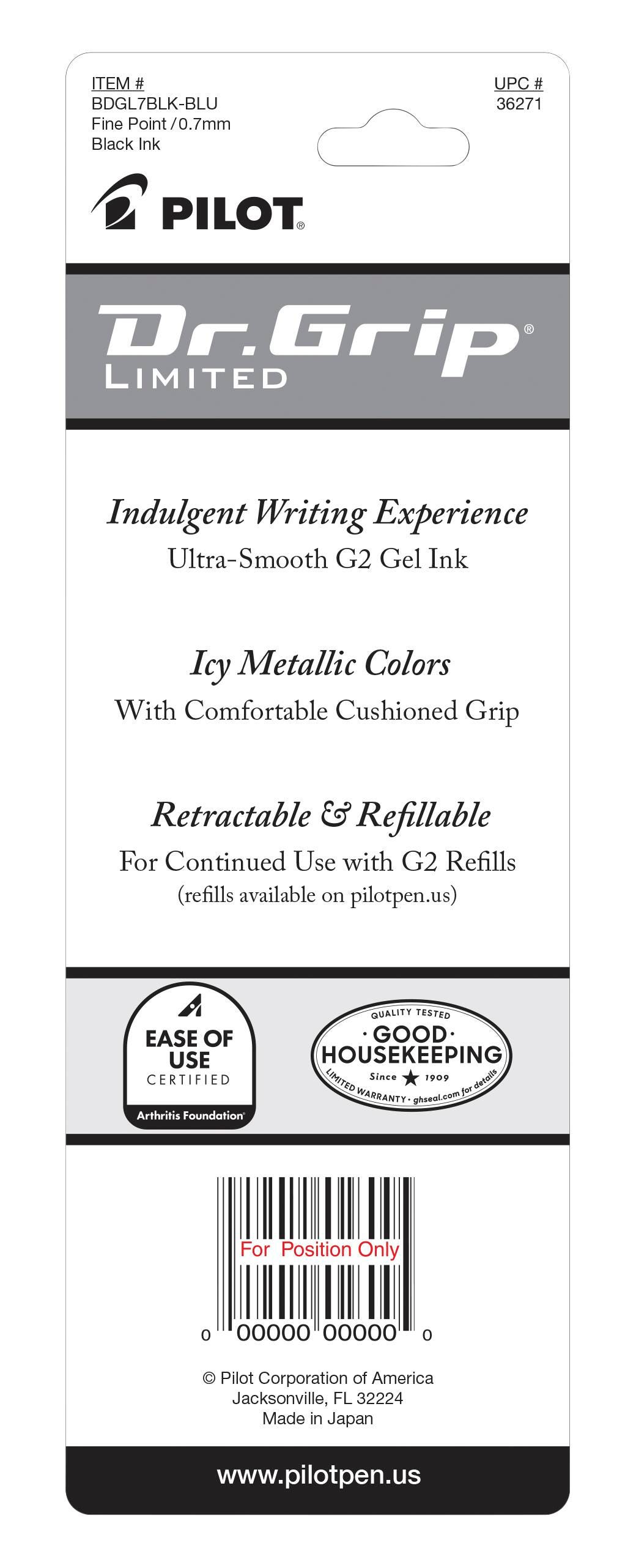 Pilot's Dr. Grip Limited (Gel) is designed specifically for the sophisticated individual who desires both modern, professional style and incredible writing comfort. Dr. Grip Limited combines the best that Pilot has to offer in both the gel ink and ergonomic pen categories. Only Dr. Grip Limited delivers Pilot's ultra-smooth #1 selling gel ink writing experience, along with the unique Dr. Grip cushioned grip and balanced barrel design, to create this one of a kind ultra-comfortable, ultra-smooth, indulgent writing experience. This pen features an ice blue barrel, black ink, and a fine 0.7 tip.Features