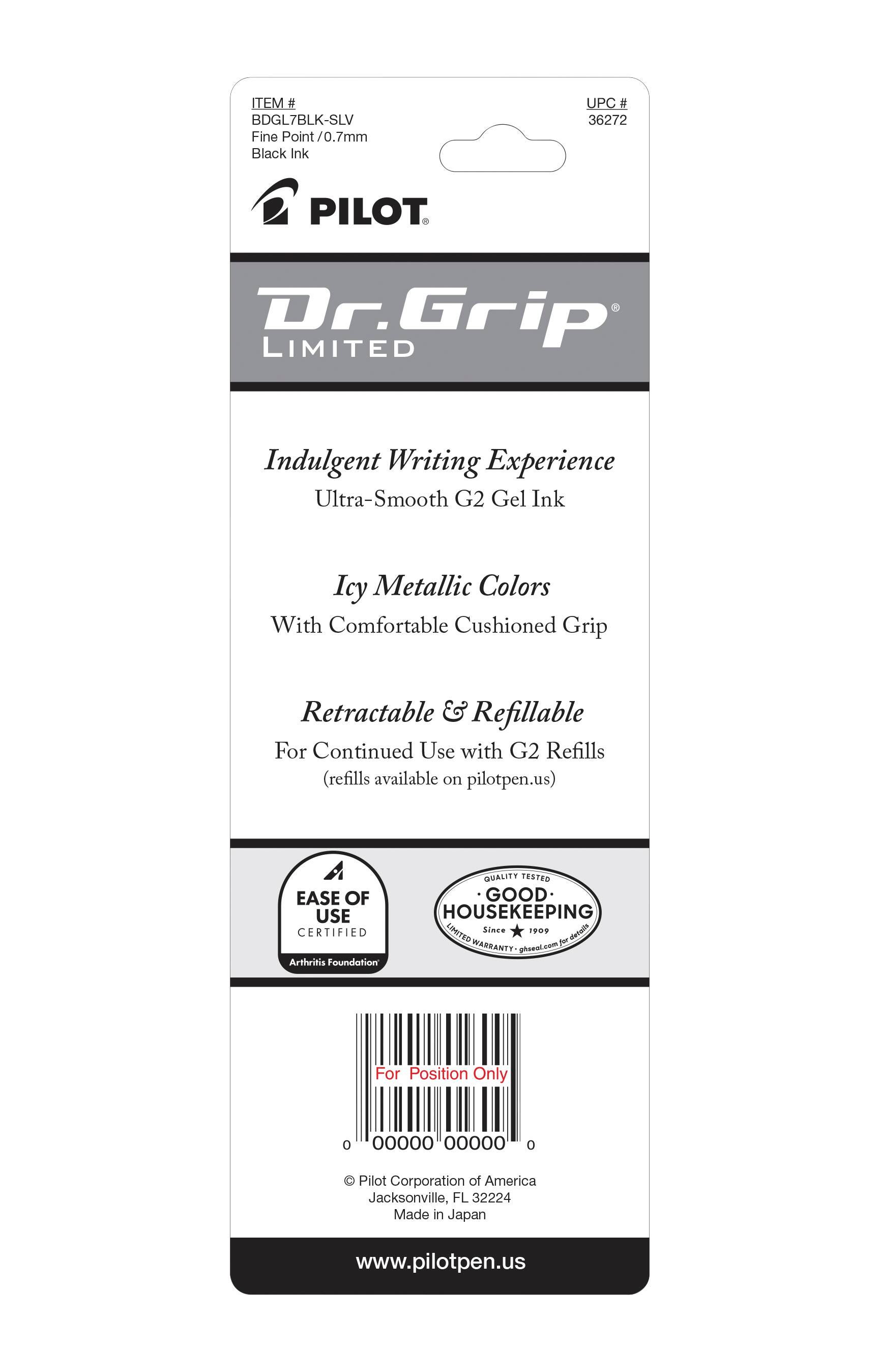 Pilot's Dr. Grip Limited (Gel) is designed specifically for the sophisticated individual who desires both modern, professional style and incredible writing comfort. Dr. Grip Limited combines the best that Pilot has to offer in both the gel ink and ergonomic pen categories. Only Dr. Grip Limited delivers Pilot's ultra-smooth #1 selling gel ink writing experience, along with the unique Dr. Grip cushioned grip and balanced barrel design, to create this one of a kind ultra-comfortable, ultra-smooth, indulgent writing experience. This pen features a silver barrel, black ink, and a fine 0.7 tip.Features