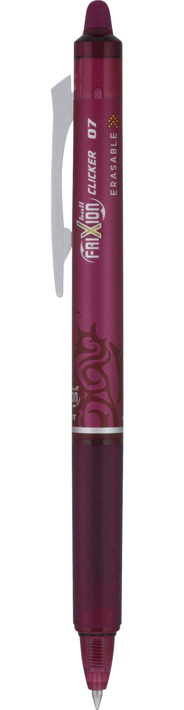 Never write a mistake again. . . guaranteed! Pilot FriXion Clicker is America’s first retractable, erasable gel ink pen that allows you to write, erase, and rewrite repeatedly without damaging documents. FriXion’s unique thermo-sensitive ink is formulated to deliver both vibrant color and smooth writing. Pilot's FriXion Clicker is refillable and comes with a retractable clip and comfortable grip. Great for editing, lists, scheduling and so much more, Pilot FriXion pens make writing stress-free and mistake-free.Features