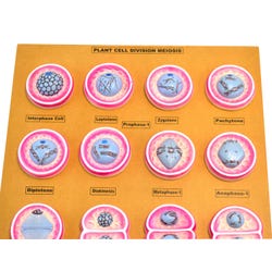This model is a 3D rendering of the process of meiosis cell division in a plant cell. The model is made of tough fiberglass molded cell models on a sturdy MDF backboard and has clearly labeled phases. The cells are shown in great detail with vibrant colors and provide an internal view of the chromosomal shifts that occur throughout the process of meiosis in a plant cell.Features