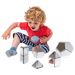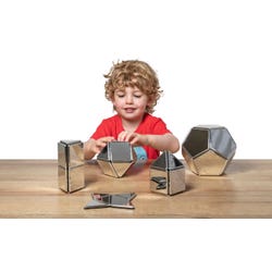 The Mirrored Magnetic Polydron set lets children design and build shiny, reflective creations. The geometric pieces come together with powerful magnets and help young learners explore shapes and develop construction skills. Polydron sets are great for sensory and educational play in a range of early childhood environments like classrooms, preschools, childcare centers, and homes. The set is constructed with a sturdy ABS material, and is easy to clean and sterilize with alcohol based sanitizer. This set contains a total of 48 pieces, with 18 triangles, 18 squares, and 12 pentagons.Features