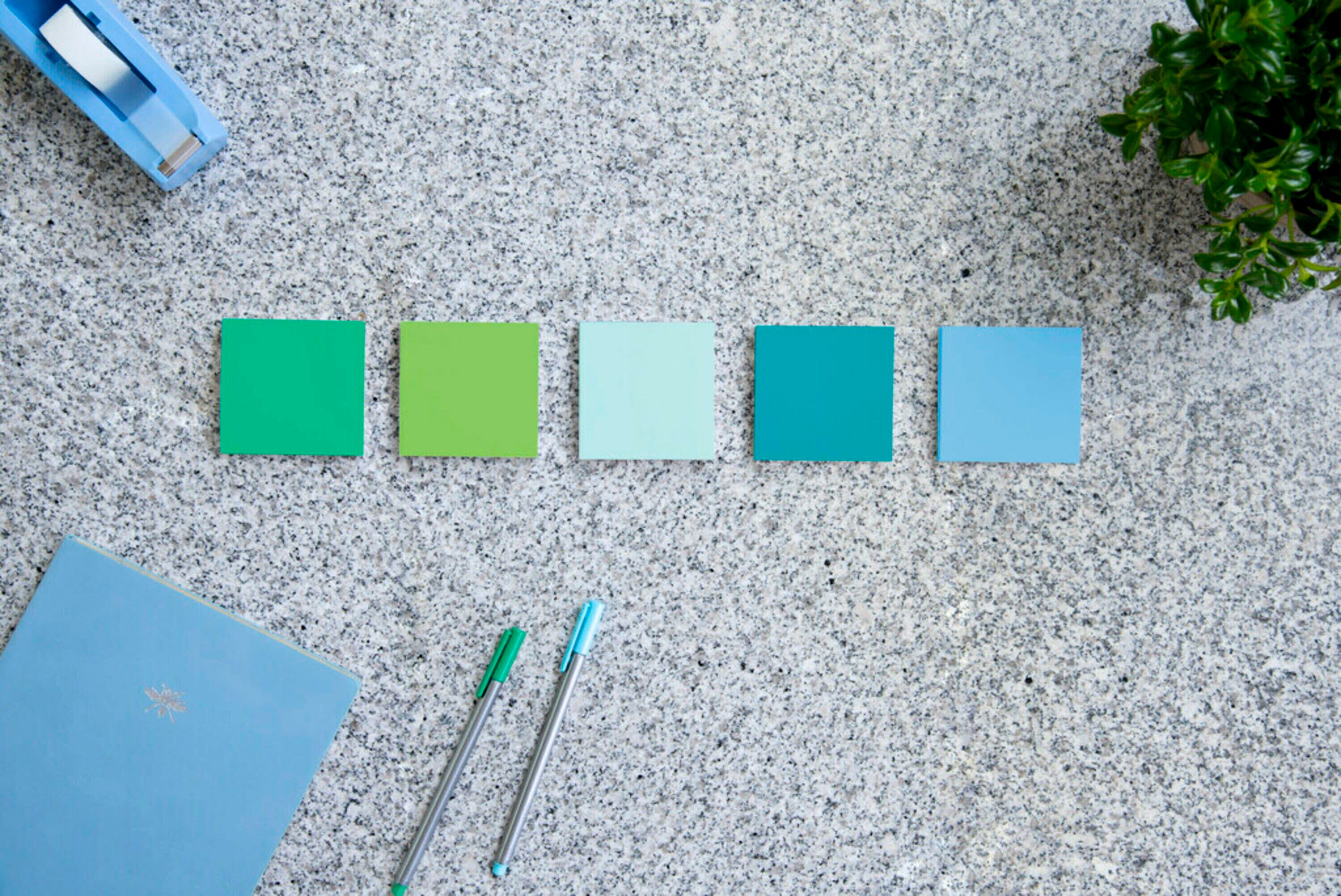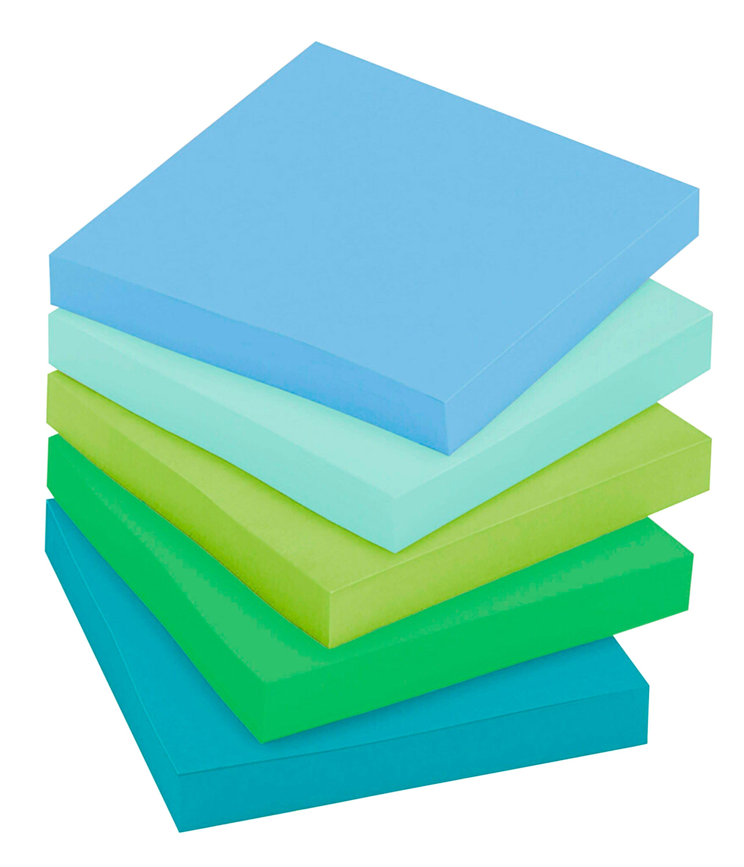 This large pack delivers Post-it® Super Sticky Notes made from 100% recycled paper with twice the sticking power to keep your notes right where you need them. These sticky notes are perfect for jotting down quick lists, messages, reminders, or tasks to keep you organized. Each note boasts a reliable water-based adhesive that firmly sticks and re-sticks to doors, windows, and walls, so your most important notes can move with you throughout your day. The soothing blues and greens of the Oasis Collection provide a calming touch, even on the busiest of days. This pack contains 12 pads, with 70 sheets in each pad.Features
