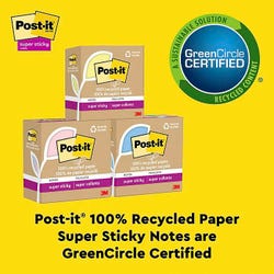 Post-it 100% Recycled Paper Super Sticky Notes are made from 100% recycled paper and feature 2X the sticking power to make sure your message stays put. The water-based adhesive reliably sticks to doors, windows, and walls, so you can take your to-do list anywhere. Post-it 100% Recycled Paper Super Sticky Notes and packaging are curbside recyclable. Succeed in your everyday tasks and feel good knowing these notes are made in a zero-waste-to-landfill plant. Packaging is also made from 100% recycled paper. Explore endless possibilities with the soothing Wanderlust Pastels collection. These pads offer 45 lined sheets per pad. 4 pads per pack.Features