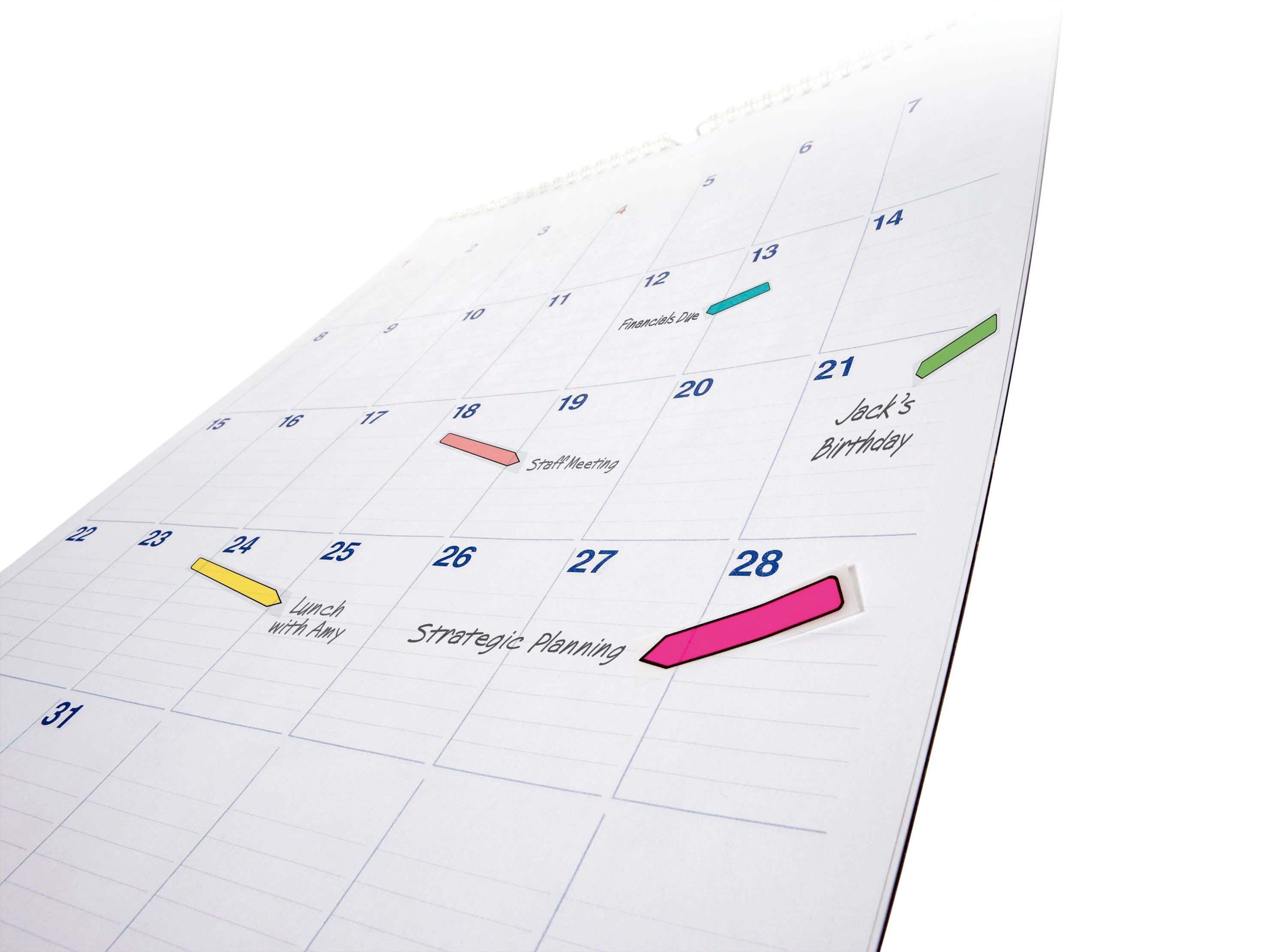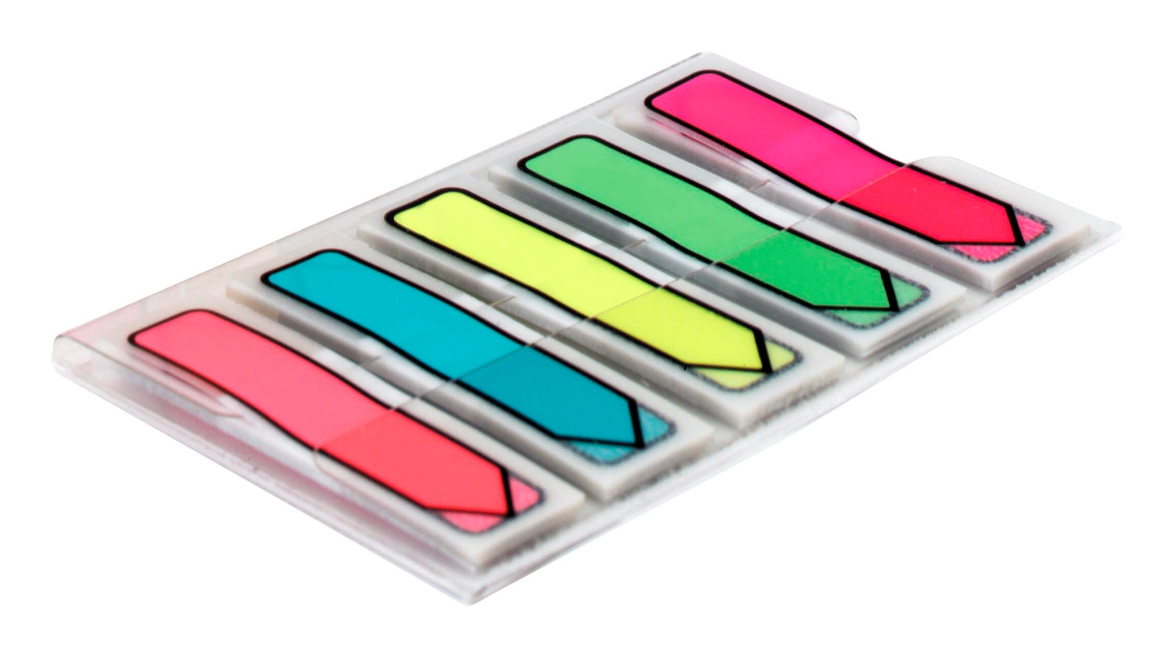 Post-it Arrow Flags in assorted red, blue, yellow, green and purple. Flags are 1/2 x 1-7/10 inches and help direct you or others to a specific point on a page. With Post-it adhesive, flags stay put yet can be repositioned or removed, without damage. The low profile dispenser keeps flags close wherever you go. Pack contains 100 flags in a single "on-the-go" dispenser.