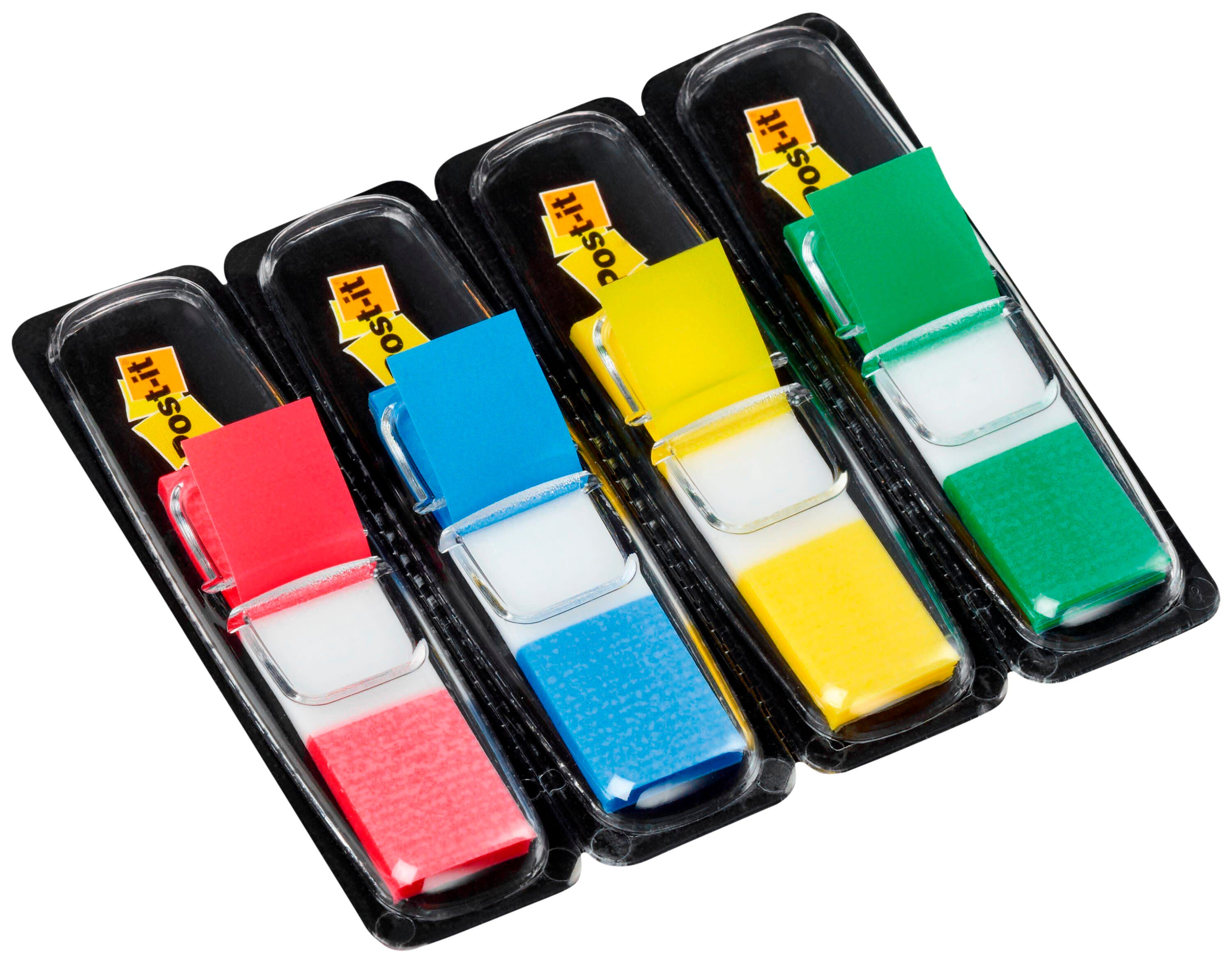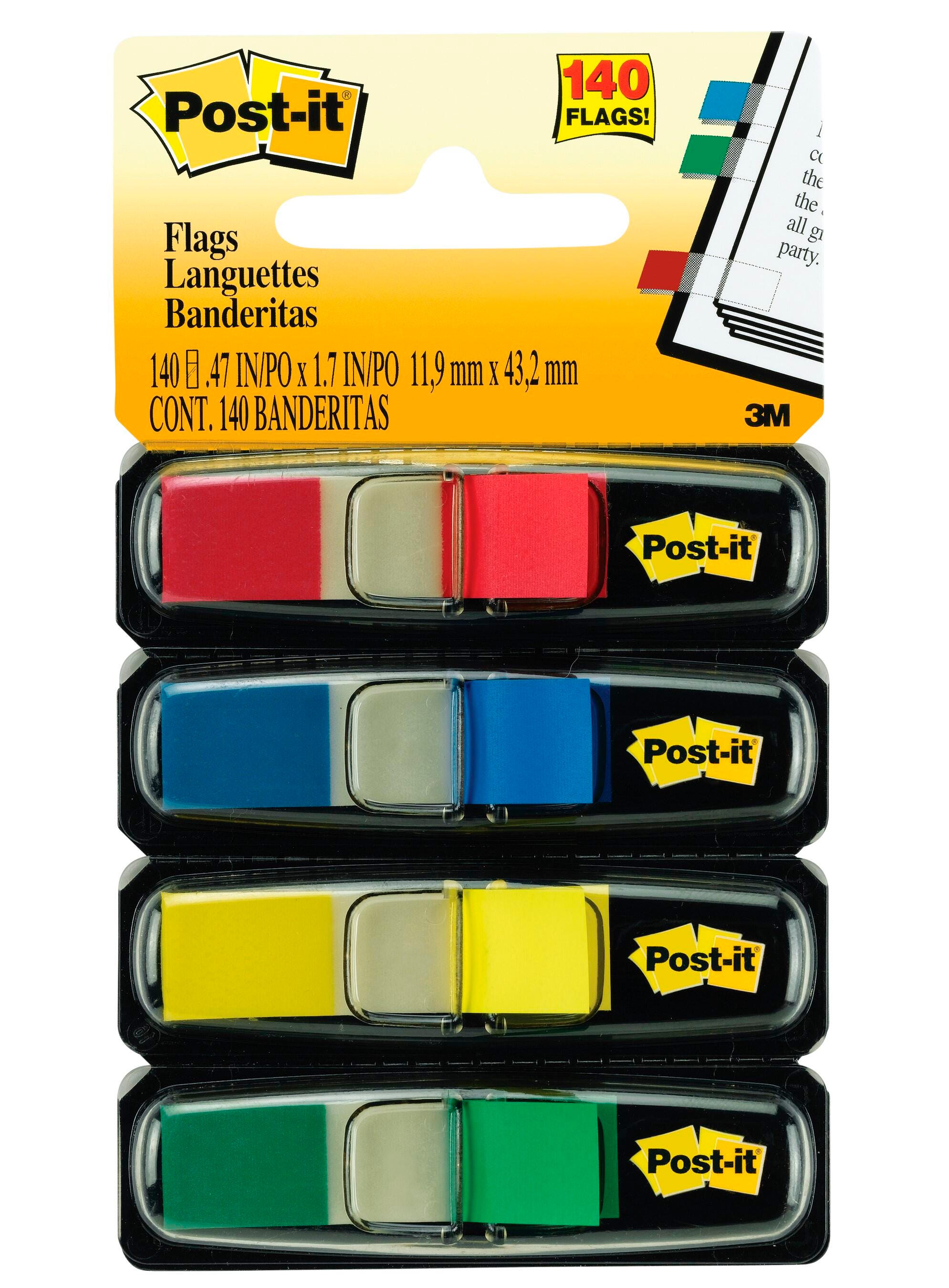 Post-it Flags in assorted primary colors save you from missing important details. The adhesive makes flags stay put and lets you reposition or remove without damage. The flags are 1/2 x 1-7/10 inches and come in red, blue, green and yellow. Eye-catching, colorful flags come in a detachable dispenser and are easy to spot, ideal for color-coding. 35 flags per color, each in it's own stand alone dispenser. 140 flags per pack.