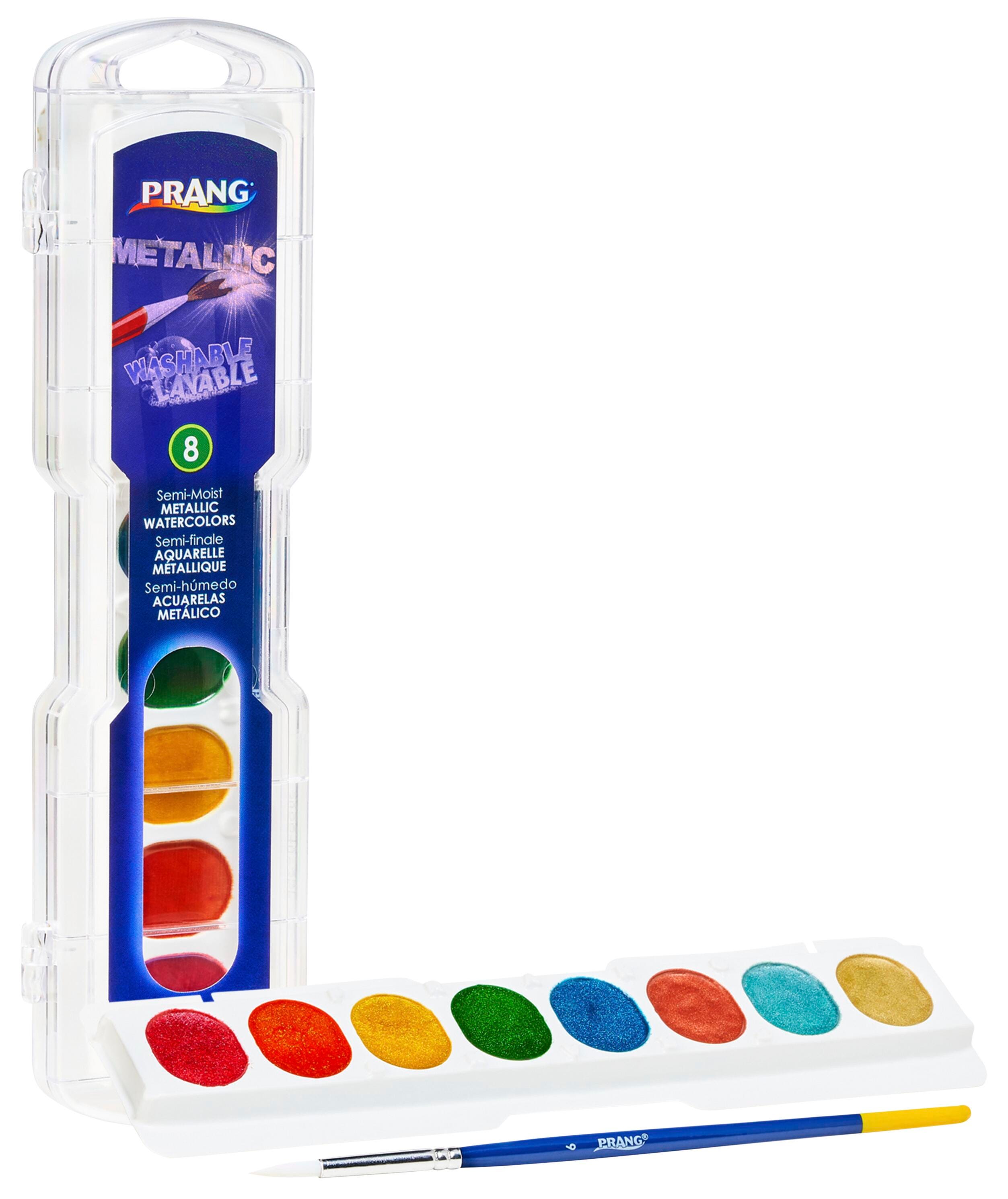 Prang Semi-Moist Metallic Washable Watercolor Paint Set is transparent and Non-Toxic in composition. Watercolors in lustrous metallic colors come with a brush. Washable Watercolor Paint Set is sold as 8 per set that includes one each of yellow, blue, green, pink, orange, gold, silver and copper colors.