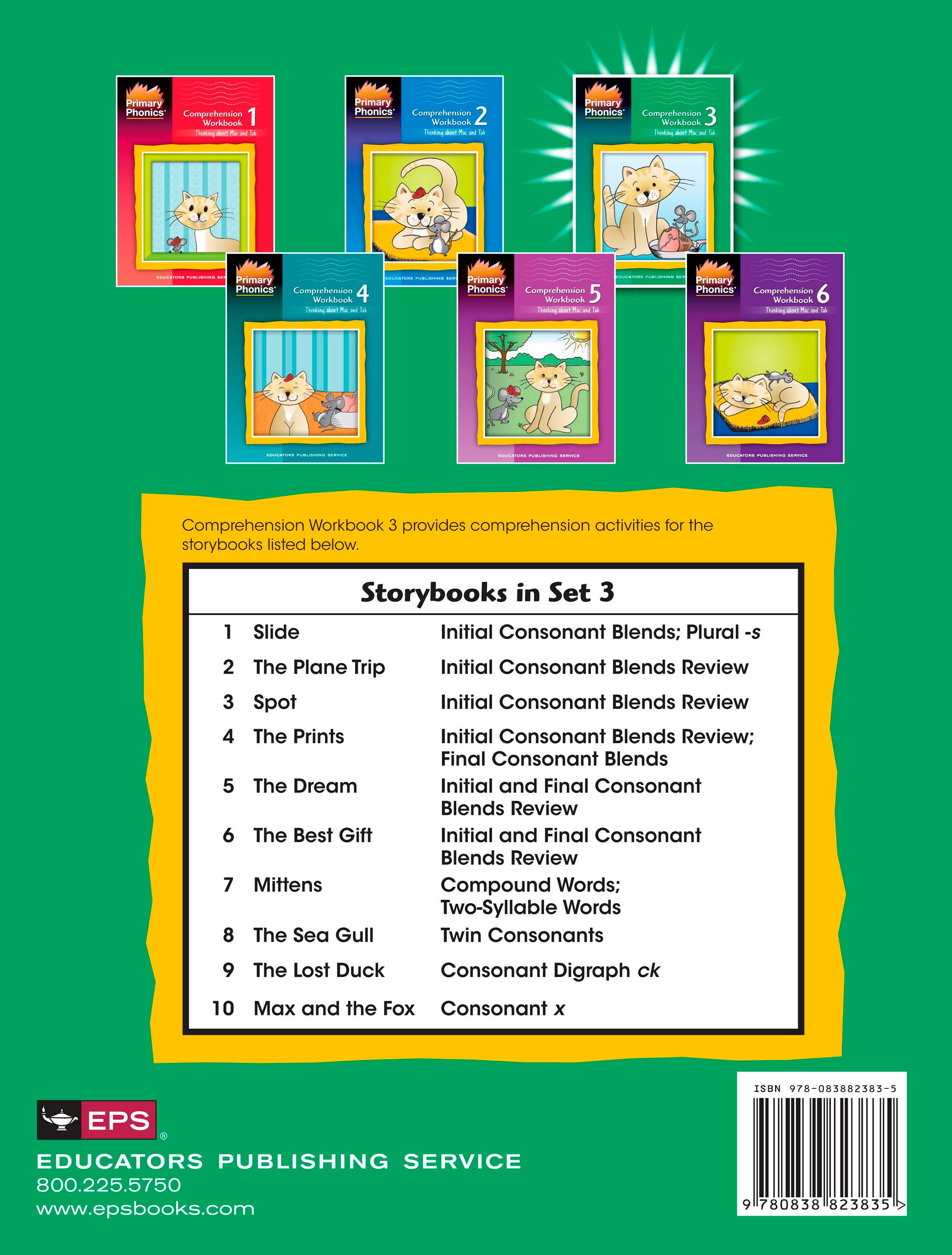 Comprehension Workbook 3 is the comprehension component to Primary Phonics Storybooks 3. This book contains early comprehension exercises designed for beginning readers. The addition of a comprehension component to workbook exercises and story reading improves the effectiveness of the Primary Phonics series and forges a closer student-text relationship while enhancing analytical skills. Exercises are included for each story in the set, which focus on sequencing, story elements, and story recall. Follow-up activities include writing and illustration. Skills addressed in this workbook include sequencing, identifying characters and events, literal comprehension questions, identifying answers in text, and matching sentences to pictures. Primary Phonics is a systematic, phonics-based early reading program that facilitates individualized instruction through flexible, skills-based workbooks and storybooks that correspond to students ability levels.
