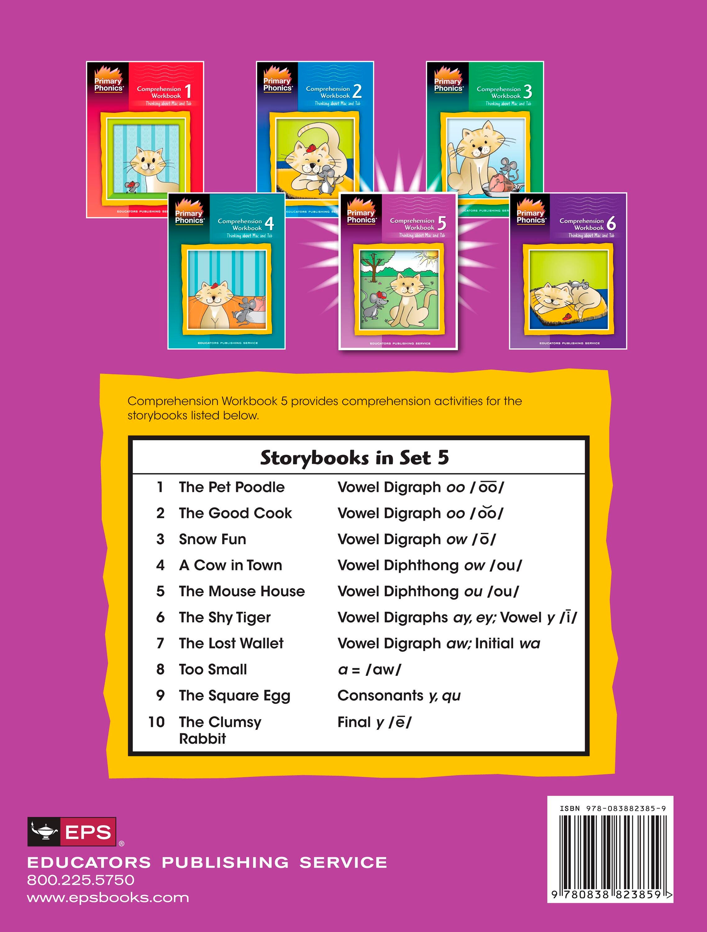 Comprehension Workbook 5 is the comprehension component to Primary Phonics Storybooks 5. This book contains early comprehension exercises designed for beginning readers. The addition of a comprehension component to workbook exercises and story reading improves the effectiveness of the Primary Phonics series and forges a closer student-text relationship while enhancing analytical skills. Exercises are included for each story in the set, which focus on sequencing, story elements, and story recall. Follow-up activities include writing and illustration. Skills addressed in this workbook include sequencing, identifying characters and events, literal comprehension questions, inferential comprehension questions, identifying answers in text, matching sentences to pictures. Primary Phonics is a systematic, phonics-based early reading program that facilitates individualized instruction through flexible, skills-based workbooks and storybooks that correspond to students ability levels.
