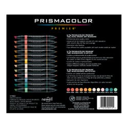 The Prismacolor Premier® Dual-Ended Art Markers offer versatility and striking color for any project! These markers boast a dual-ended design that delivers a fine tip on one end and a broad chisel tip on the other, so you can create with four line widths from one marker. The set offers gentle mid-tone colors and richly saturated ink for smooth lines and even coverage. Both tips share ink from the same reservoir to ensure consistent color for every stroke. This set contains 12 dual-tipped markers.Features