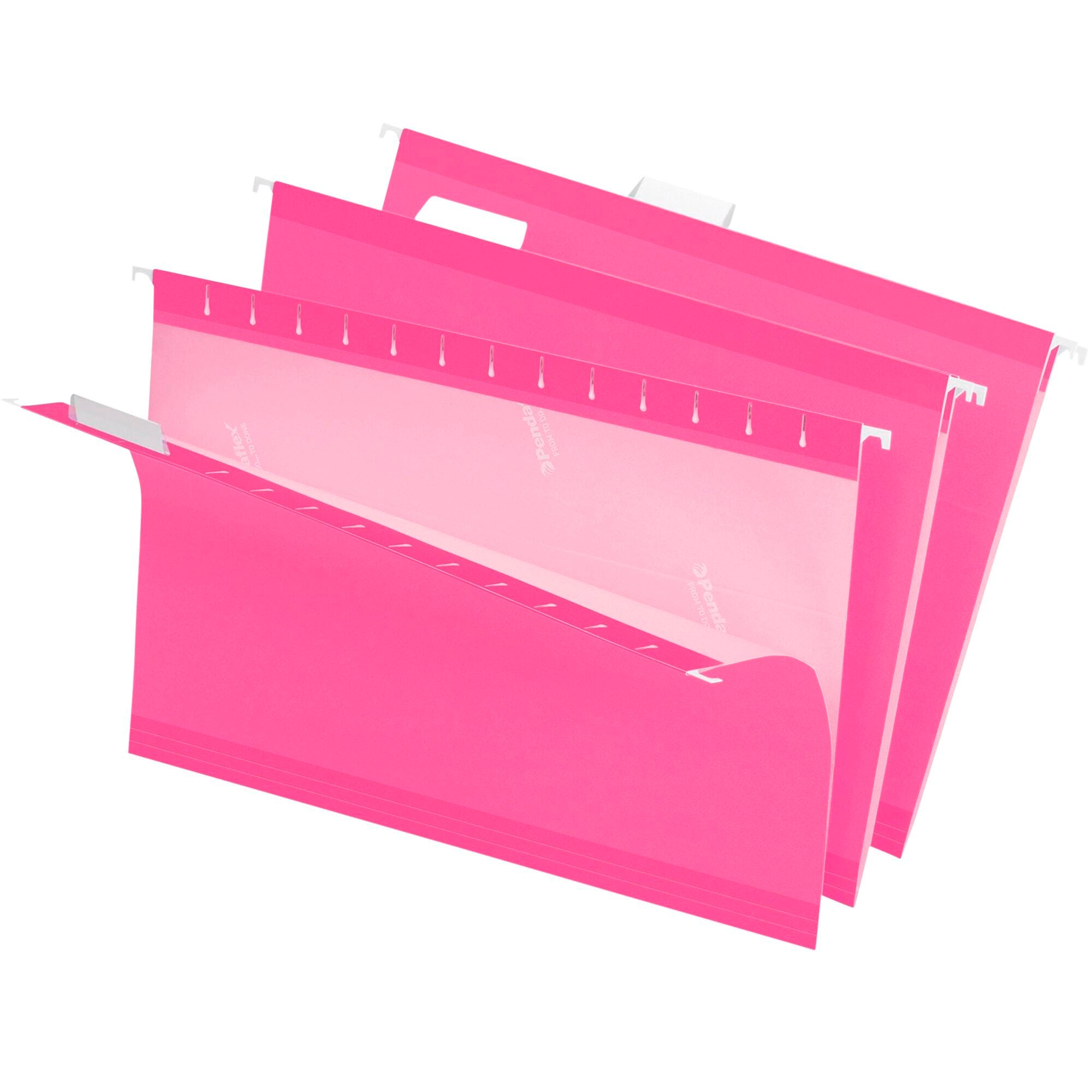 The Reinforced Hanging Folders from Quality Park are an economical and high-quality solution for your filing needs. The hanging folders have laminate strips on the top edge and bottom fold to resist rips and tears. These vibrant pink file folders are designed with a lighter interior that helps prevent misfiling. The folders are designed to fit legal size documents, and are compatible with 1/5 cut tabs for labeling. Each box includes a letter-sized, printer-ready label sheet and 25 clear 1/5-cut tabs so you are ready to create custom labels. This box contains 25 folders.Features