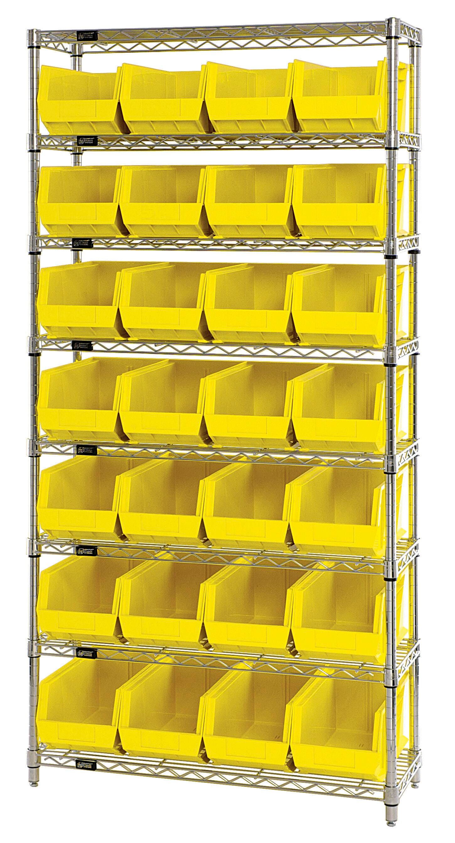 Economical, high density bin storage system includes heavy-duty stack bins with open hopper fronts for easy access. Chrome finish wire shelving has a 400-pound capacity per shelf. Shelving unit has 8 shelves total and measures 36 W x 14 D x 74 H inches.Features