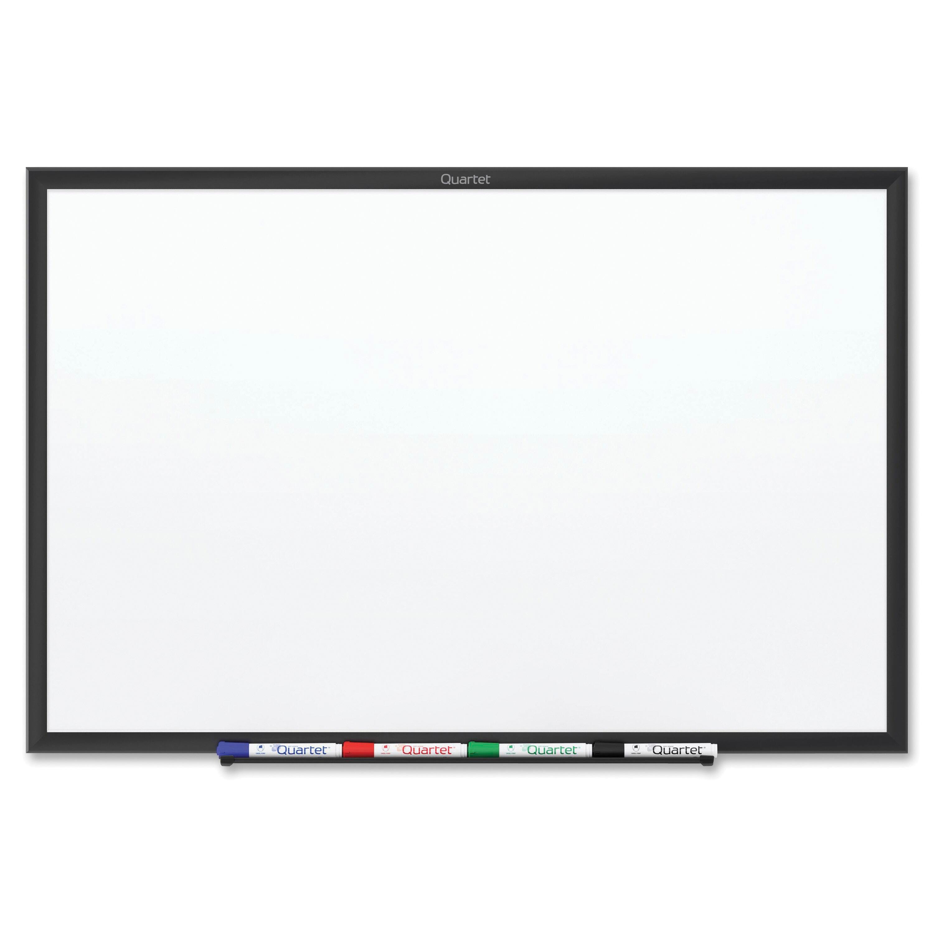 Quartet Magnetic Dry-Erase Board with a black aluminum frame measures 48 W x 36 H inches and is perfect for balanced use in spaces with regular traffic. Board provides smooth, blank writing surface for jotting down reminders, collaborating with others and keeping yourself organized. It has magnetic quality with a steel backing that lets the surface act as a whiteboard and a magnetic bulletin board. It lets messages to be written on using dry-erase markers and magnets are used to hang the documents on the board. Board features a stylish aluminum frame with a black finish and offers extended life when its surface is cleaned using Quartet cleaning solutions. Board includes a dry-erase marker with a chisel tip along with the mounting hardware and the marker tray is used to store the accessories.