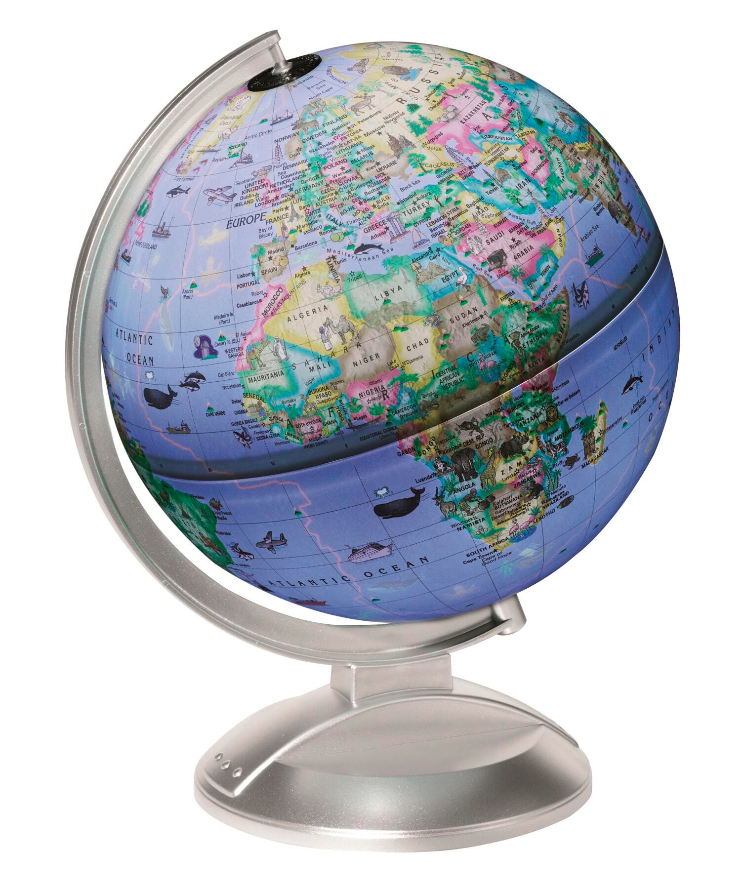 The New Globe 4 Kids with augmented reality features more than 125 drawings of people, landmarks and animals on this kid friendly political map. Turn on the light to see a physical map showing hidden aquatic animals, ship wrecks and earth features such as tectonic plates and trench formations. Also, includes our new augmented reality feature. Download the free app to your smart phone or tablet to gain access to multiple category of features including Animals, Aviation, Climate, Countries, Dinosaurs, Landmarks, Moon, Planets and more. Just point your phone or tablet toward the globe and start to explore.