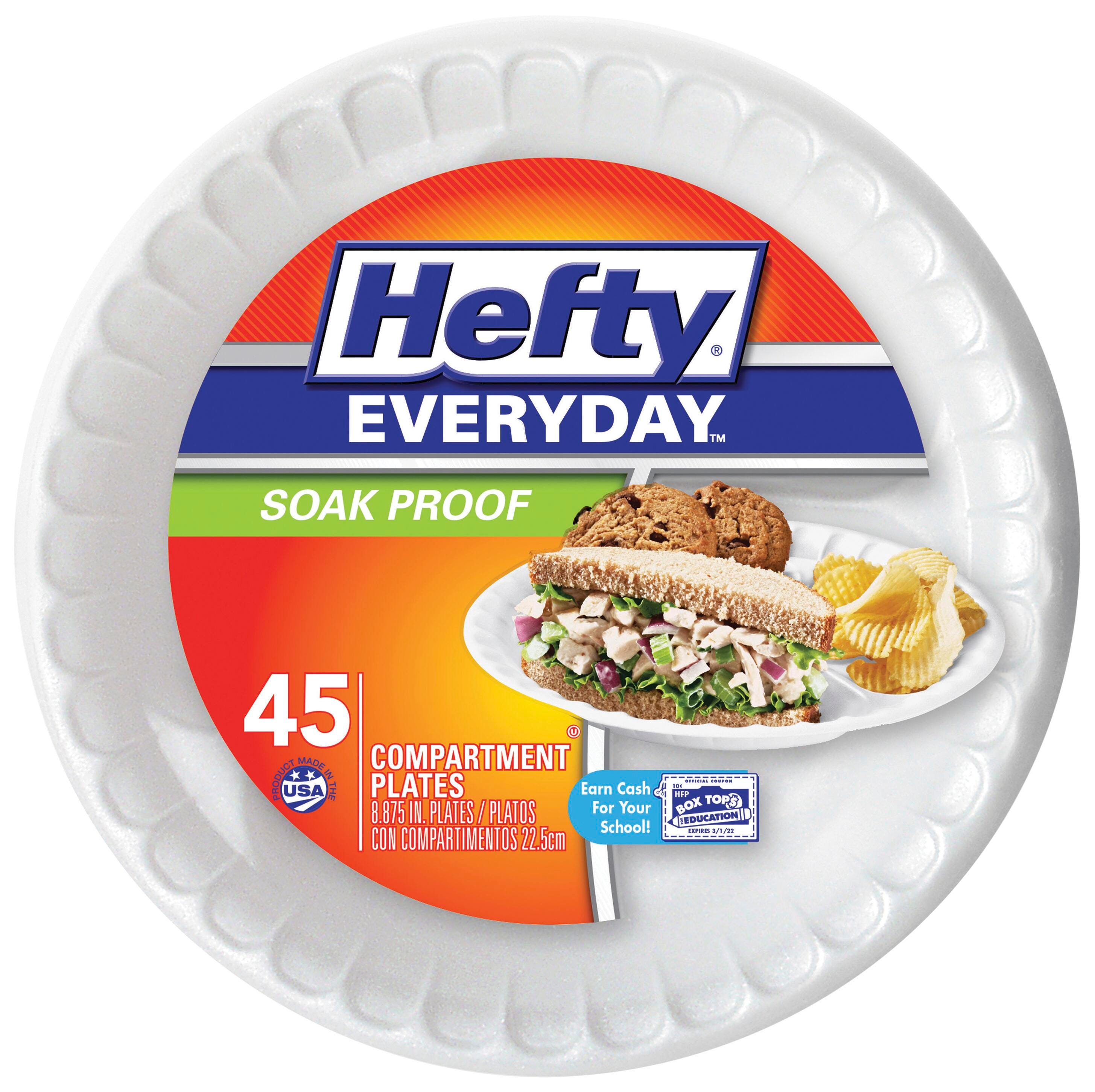 Sturdy plates are made with coated foam to resist leaking and soak-through. Each plate is divided into three sections to separate food and hold sauces. Ideal for casual entertaining or everyday use. Hefty Everyday Plates are the perfect disposable tableware to keep on hand.