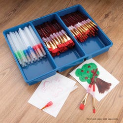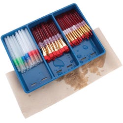 Brushes have synthetic fibers fixed in seamless ferrules for smooth application and are dyed to match the handle color. The acrylic handles have a soft, no slip rubber grips for durability and convenient use. Brushes come in a durable plastic drying tray with sloped compartments so water flows away from brushes and out openings that drain into the lid. Also includes 18 Aqua-Flo Brushes.Features
