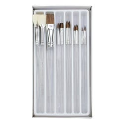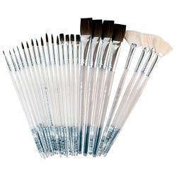 This assortment of 24 Clear Choice brushes have standard acrylic handles that won't chip or peel and are constructed with soft natural hair. Ideal for ceramic finishes and glazes, this assorted paint brush set contains 4 each of Size 0 round brushes, Size 3 round brushes, Size 5 round brushes, Size 8 flat brushes, 3/4 inch glaze brushes, and Size 8 fan brushes.Features
