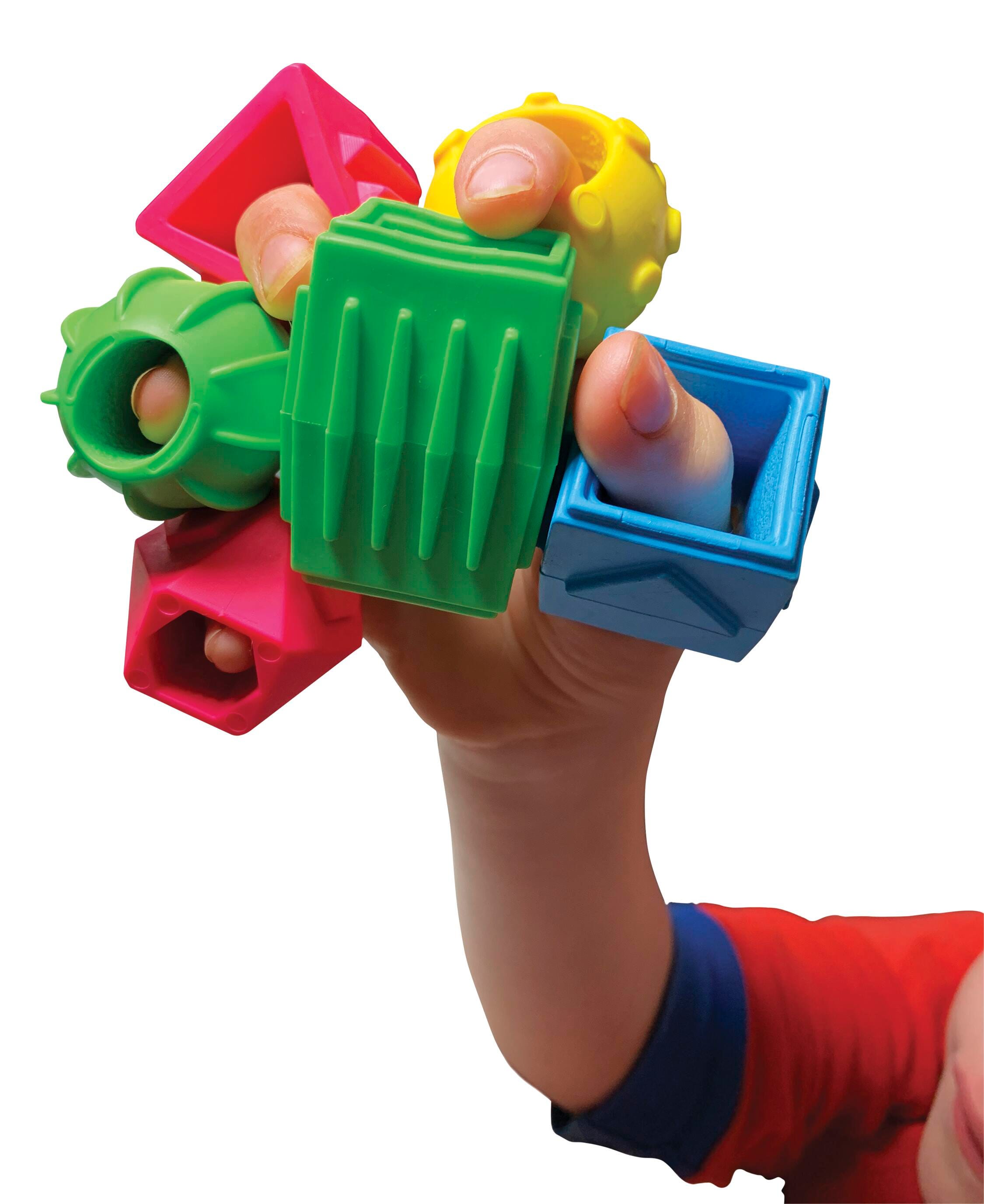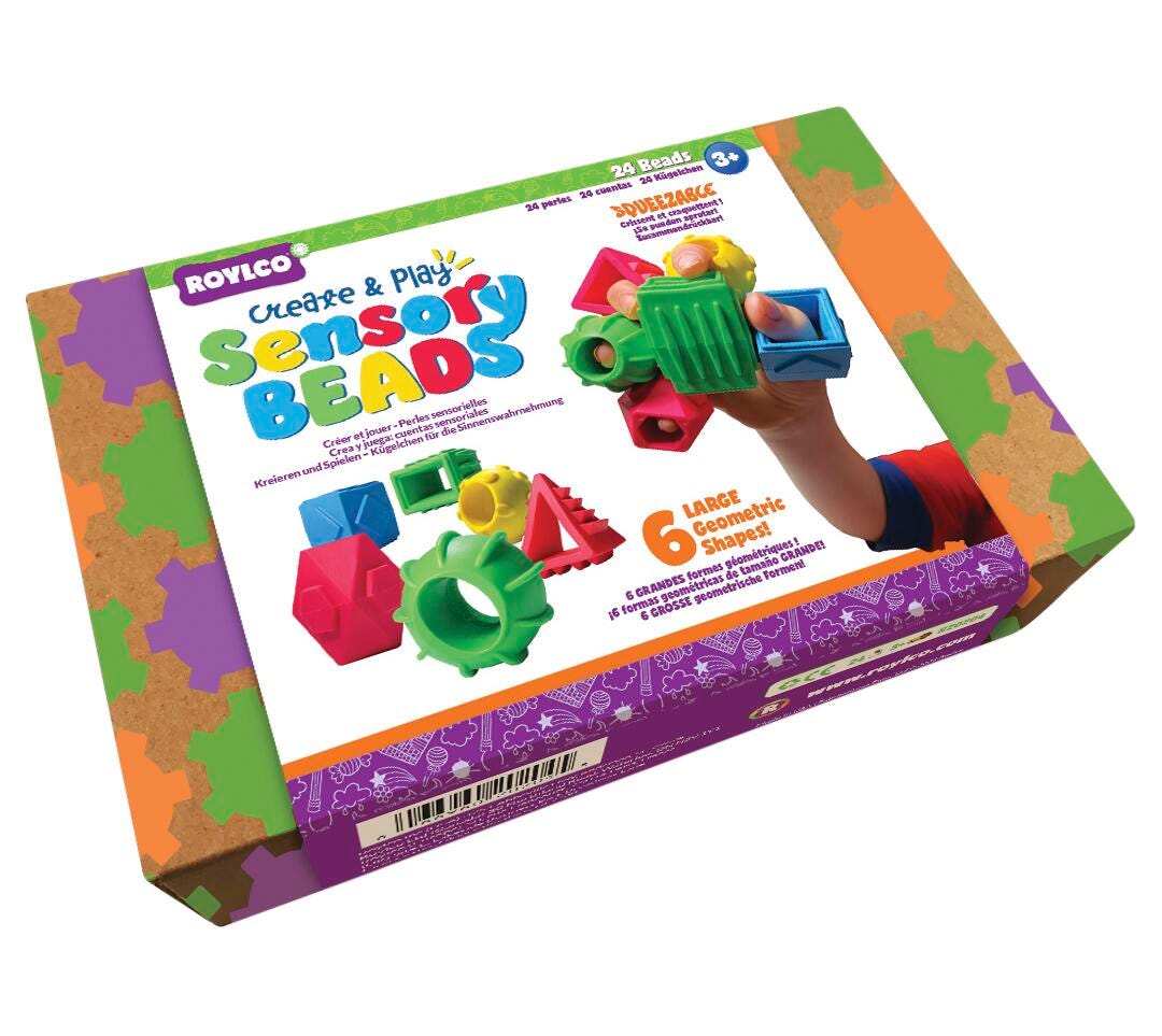 The brightly colored material is soft and flexible, yet durable enough for lots of touching and squeezing. Each shape has a recognizable geometric form: triangle, circle, oval, rectangle, square, hexagon. The surfaces have raised bumps, ridges and grooves that reflect the overall shape and stimulate the sense of touch. Each textured bead has an extra-large threading hole, making it easy to string them all together using a variety of materials. Use this set of sensory beads to help kids reduce stress while developing fine motor skills. The material is excellent for art activities. Press the shapes into clay to create fun, squishy patterns. Dip them into paint or press them into an ink pad to create colorful artwork!