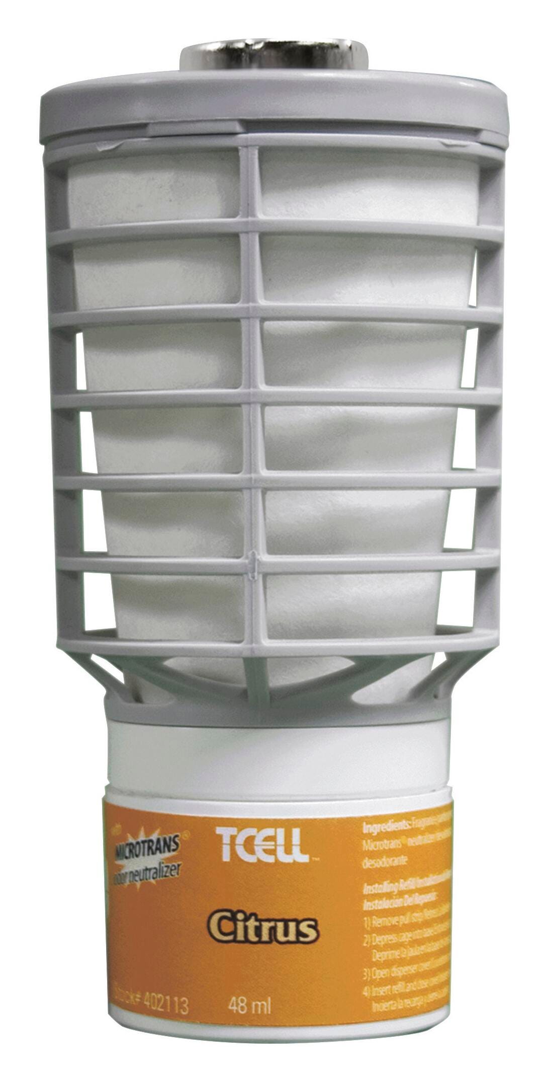 Rubbermaid Comm. TCell Dispenser Fragrance Refill is part of an odor control system that dispenses a consistent level of fragrance and Microtrans odor neutralizer. Inside a Rubbermaid TCell dispenser, the fresh fragrance and odor neutralizer are distributed throughout the room. Refill lasts approximately 60 days on the standard setting for a washroom with three to four stalls/fixtures. It can last for approximately 90 days in a small washroom with one to two stalls/fixtures. Refill contains no propellants or added VOCs.