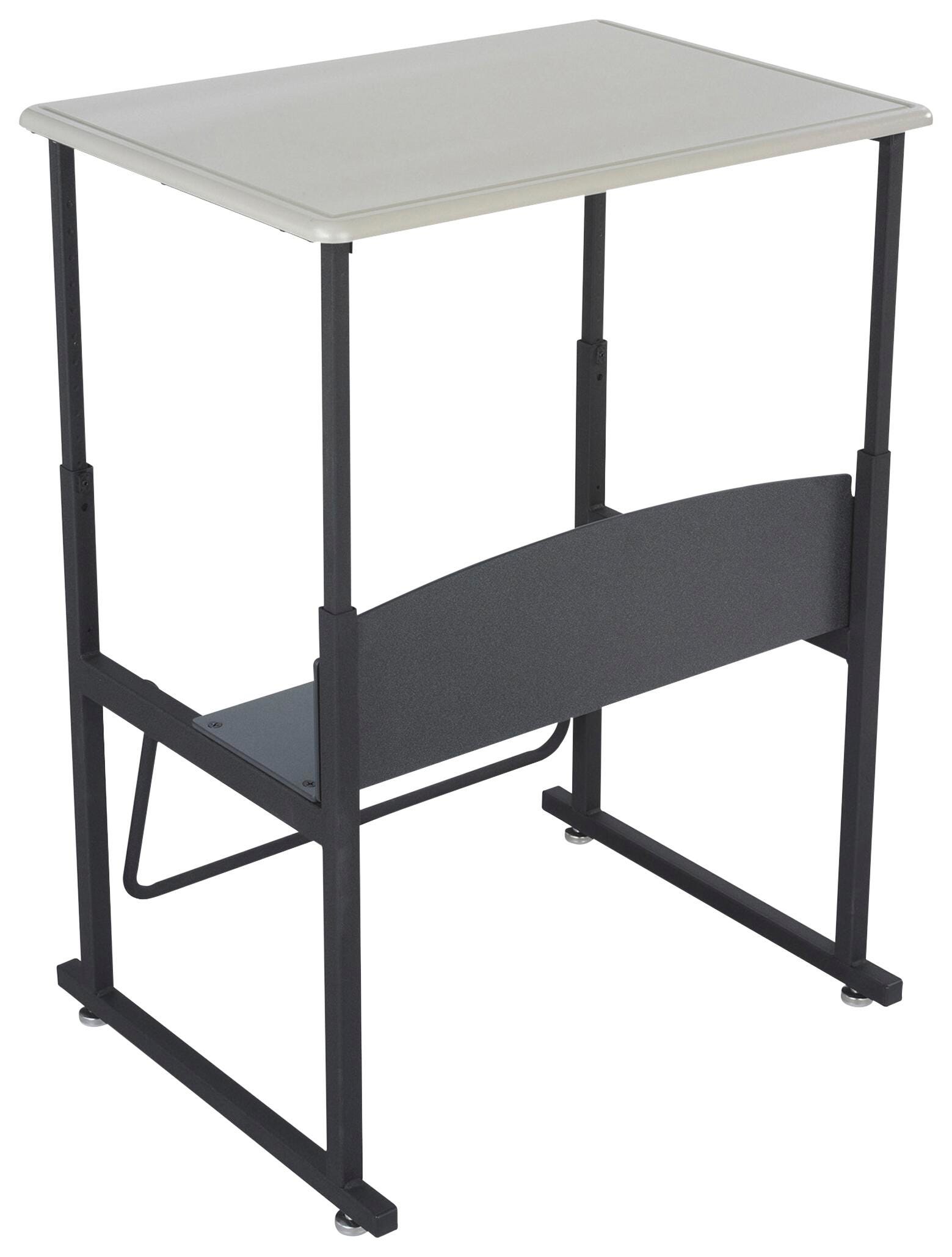 The AlphaBetter Desk is a Beige, height-adjustable desk standing 26 to 42 inches high, designed for children grades 3-12. With a fire and impact-resistant laminated desktop and durable steel frame, AlphaBetter desks provide comfort and convenience for every user. The standing desk offers natural movement via the Patented Swinging Pendulum Footrest Bar. Plus optimal shelf storage for school supplies and books.