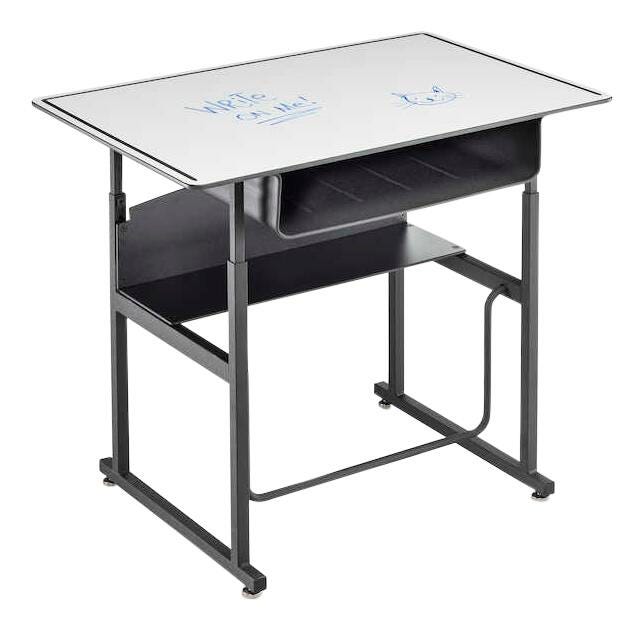 The Safco Alphabetter Adjustable-Height Desk gives students the chance to be more active within a classroom setting. The Patented Swinging Pendulum Footrest Bar allows students to redirect excess energy and engage in continuous motion that may help support ergonomic comfort and cardiovascular health, while potentially increasing calorie burn, productivity, and focus. Adjustable nylon base levelers for stabilization and easy movement across smooth and carpeted floors. Steel base with black powder coat finish makes this a durable desk. Features a dry erase board top.