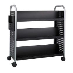 Safco Scoot Book Cart features a durable black powder-coat finish and tubular steel legs. Double-sided cart is made with durable steel construction and comes with six sloping shelves designed to hold large books and reference materials, perfect for books up to 8 L x 12 H inches. Cart has oversized dual-wheel, 3-inch diameter casters that render easy porting of books and other reference materials. Assembly required. Measures 41-1/4 W x 17-3/4 D x 41-1/4 H inches.Features