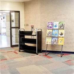 - Sloping shelves prevent reference materials for falling from this book truck when in motion